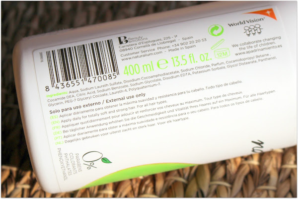 Es indicado para todo tipo de cabello y es de uso diario. Os dejo una curiosa imagen con los ingredientes del champú. Veréis que el nombre engaña, porque realmente sus componentes no son naturales (al contrario de lo que predica su página web), es algo que me sorprendió.