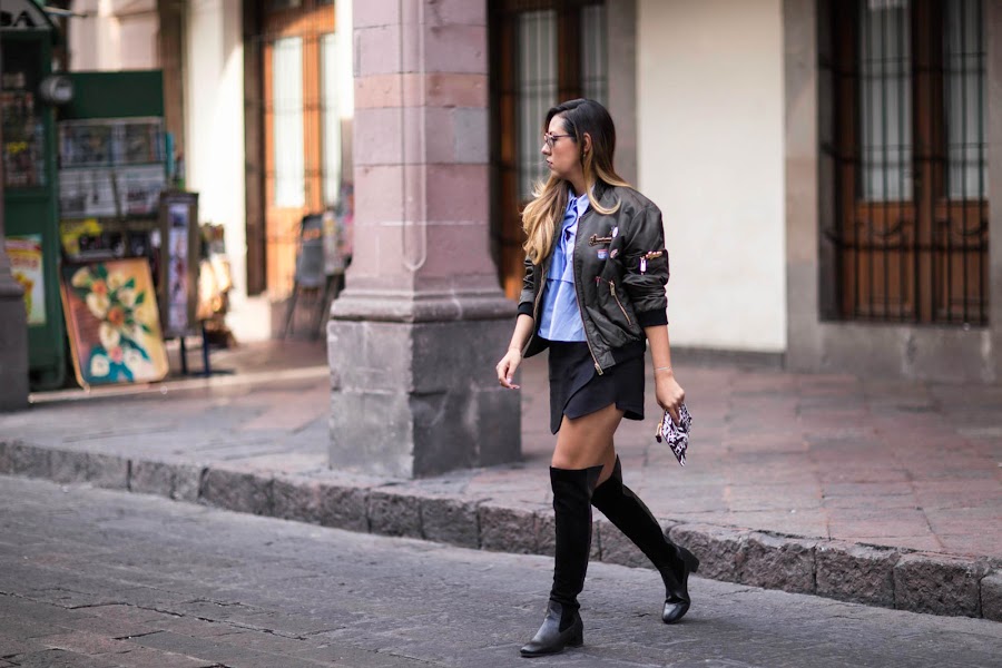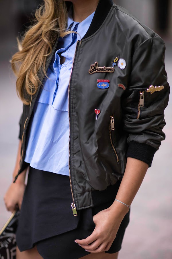 El outfit de hoy lo hice en base a diferentes prendas que ya son tendencia en esta temporada y seguiremos viendo las próximas. La primera es la "bomber jacket" si están pensando que se han usado siempre, tienen razón. Esta prenda tiene un corte sencillo que en un principio la usaban los pilotos de la milicia pero ahora la podemos encontrar en todos los colores, texturas, marcas, etc. Pero ahora una de las novedades es que podemos jugar mucho con ella, por ejemplo yo la personalice con "pines y broches" otra de las grandes tendencias de la temporada, puedes encontrar paquetes de estos inclusive de parches en tiendas como Zara o Stradivarius.