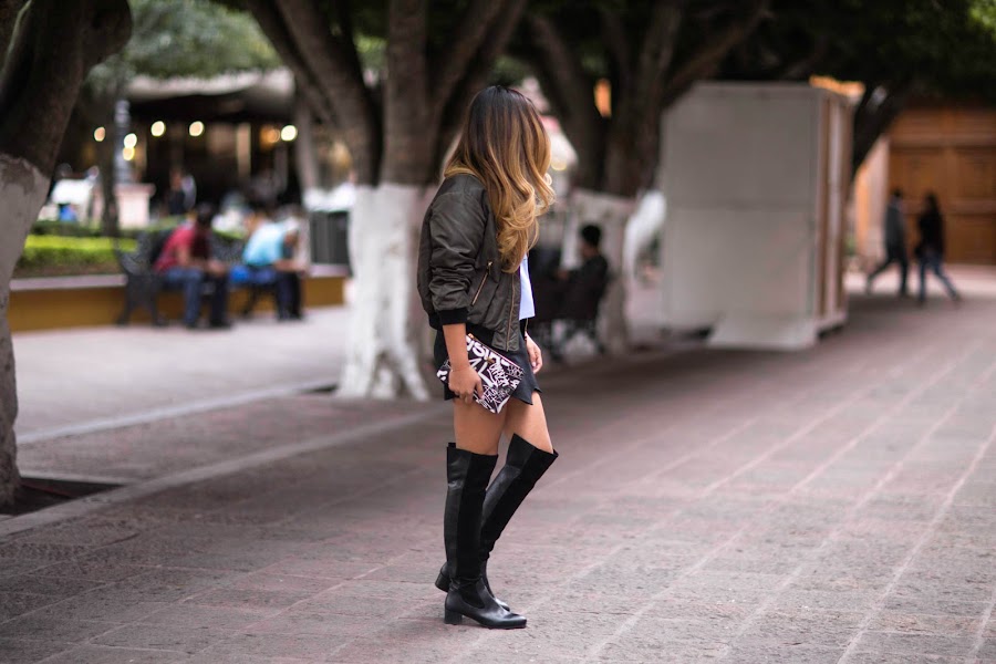 Como el clima comienza a mejorar y el frío esta comenzando a desaparecer decidí llevar un short (falta + shorts) esté ya es viejito pero me encanta como logra darle un toque más estructurado al look ya que el resto de las prendas son mucho más fluidas. Lo combine con unas botas altas que tiene la mezcla de dos texturas, piel y suede en color negro, me gusto mucho que son altas y logran cubrir la rodilla pero no son tanto que resulten incomodas, además tienen un pequeño tacón cuadrado que las hacen cómodas pero a la vez lucen casuales y no informales. El bolso es regalo de mi esposo, es un clutch de la marca MOSCHINO.