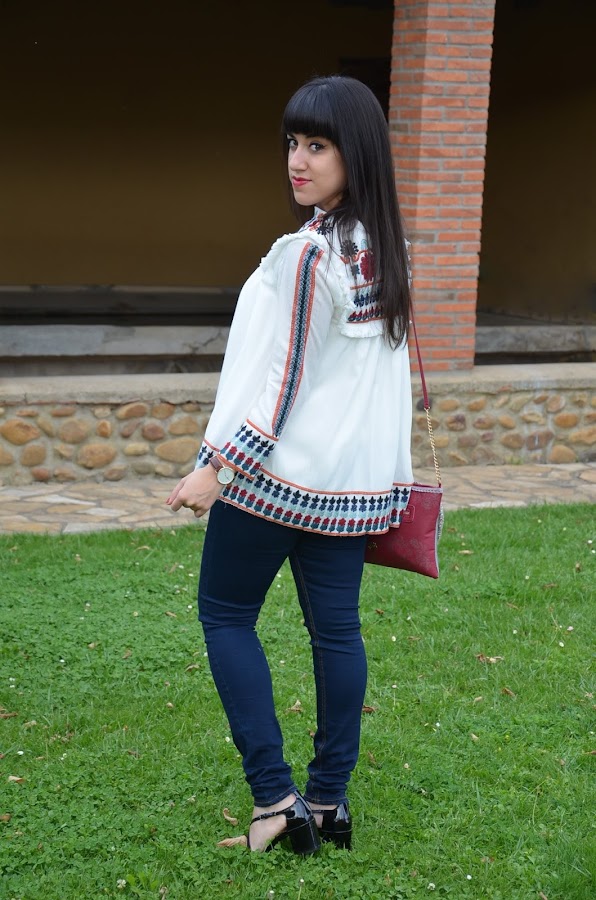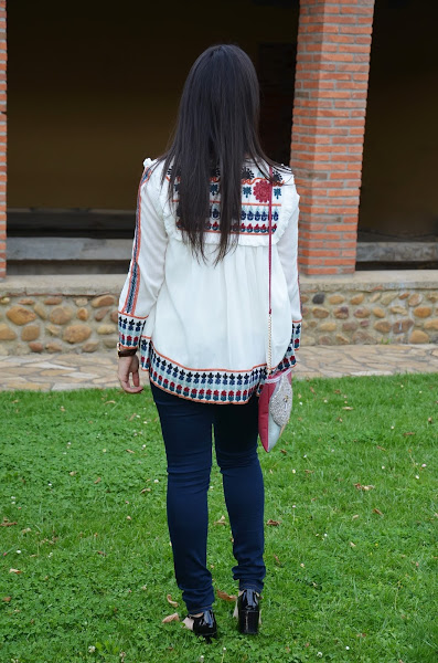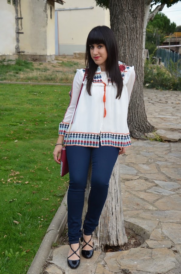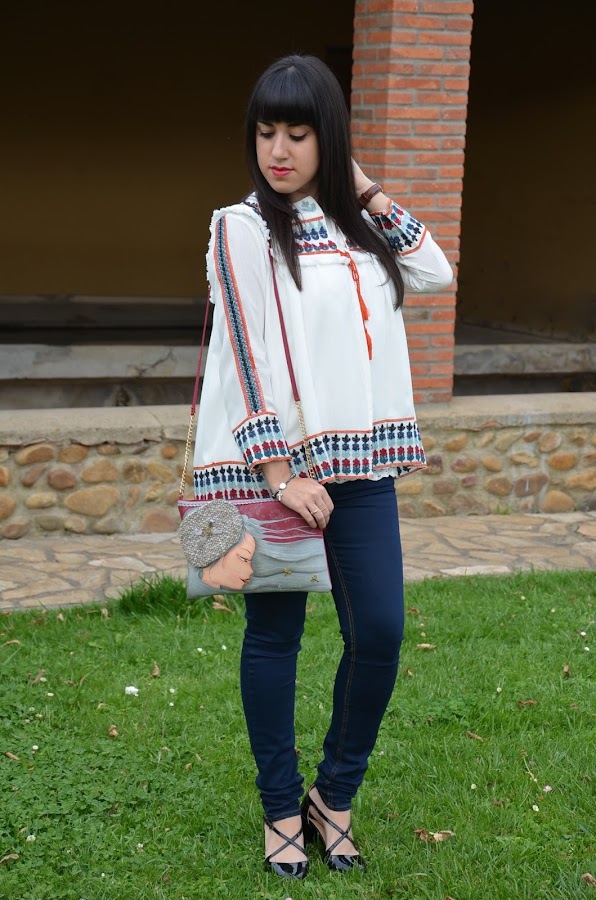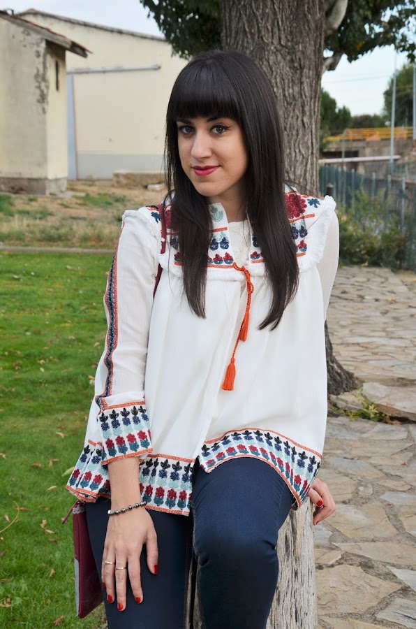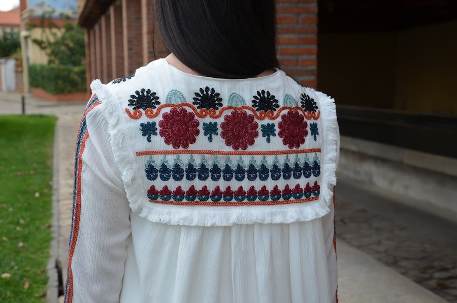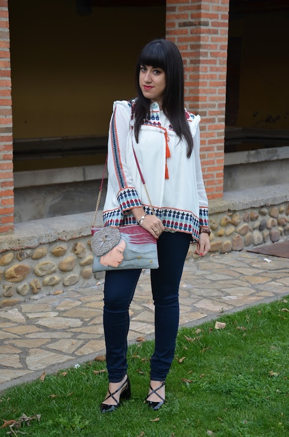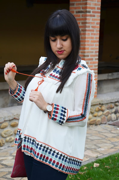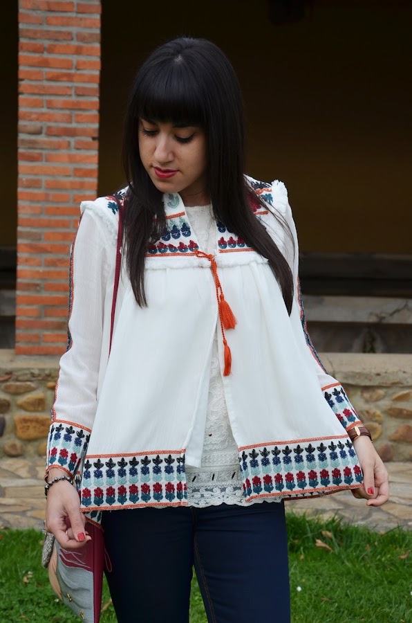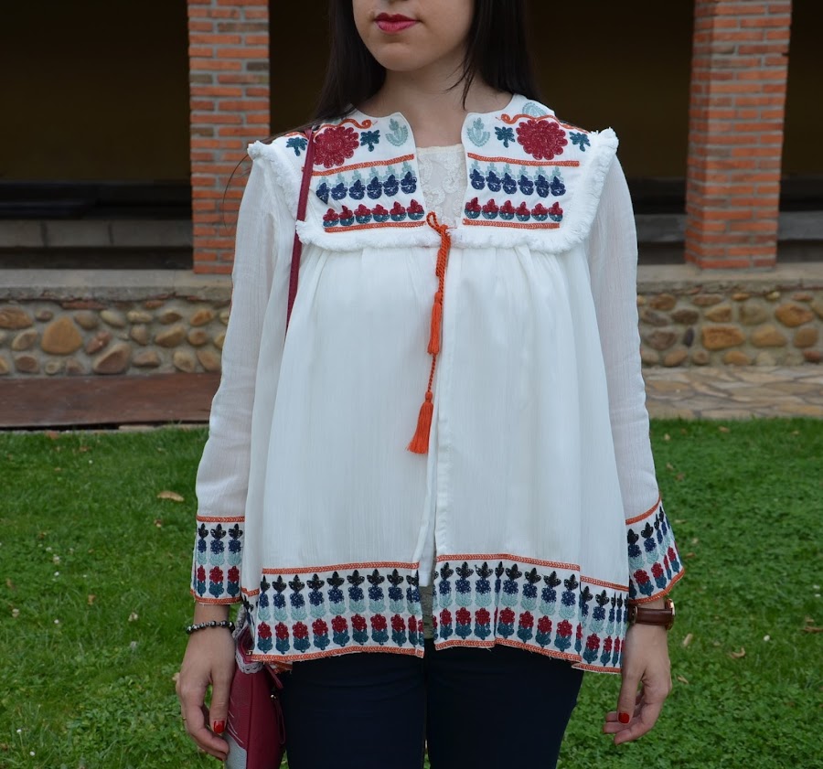 Es una prenda ligera, me encanta con sus bordados y flecos y una mezcla de colores muy delicada y elegante, por ello lo combiné con vaqueros y zapatos negros, algo sencillo que no le restara protagonismo.