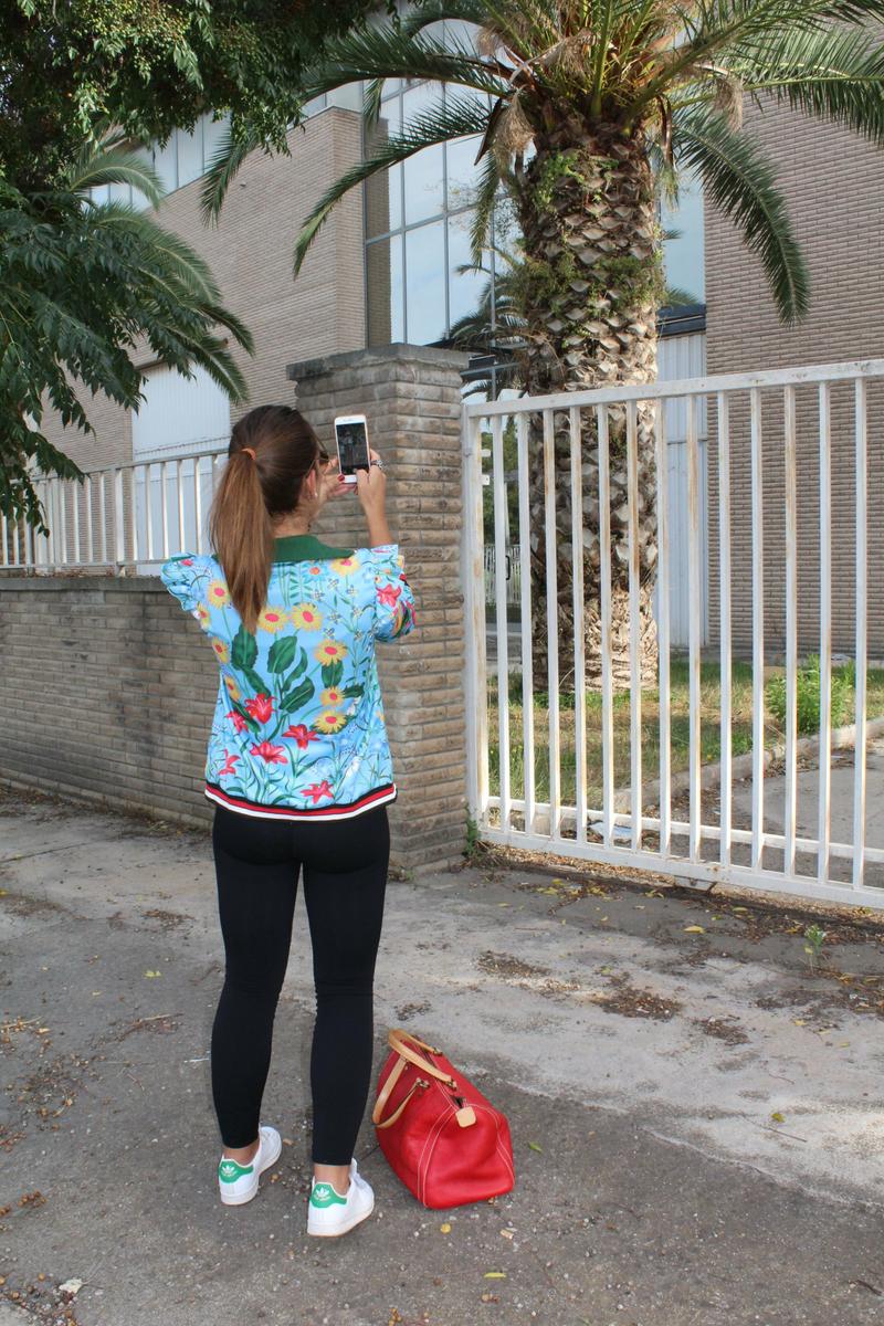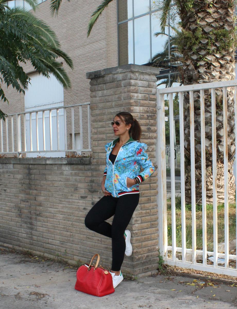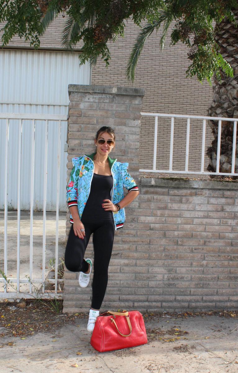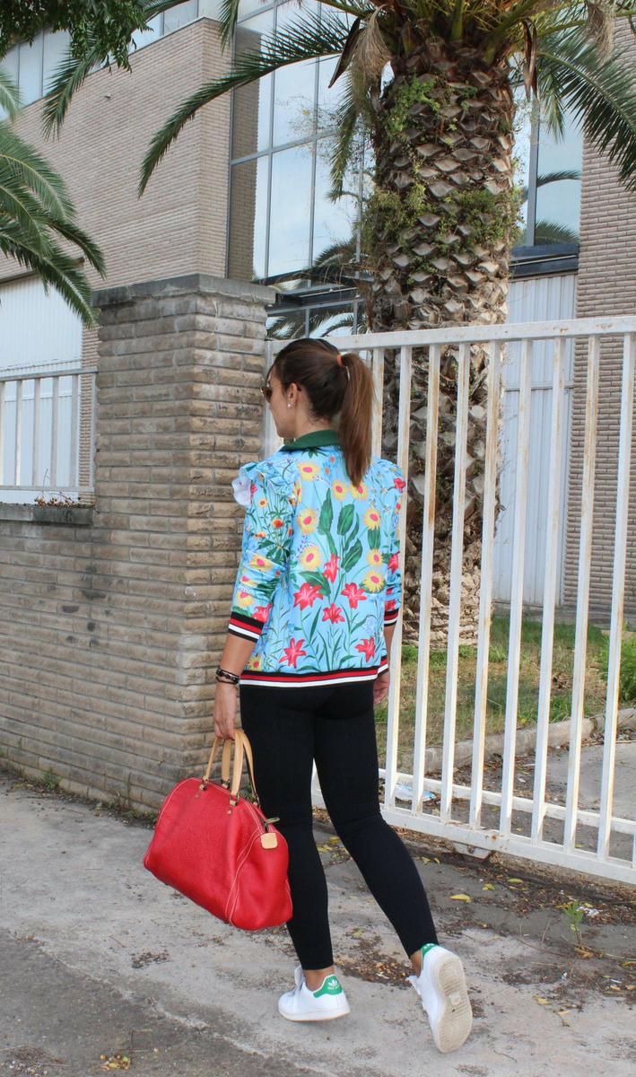 Mi look de hoy, es un look muy sencillo, la base es un total black compuesto por prendas básicas, como son unos leggins y una camiseta, y la parte colorida la pone la chaqueta con un print floral de SHEIN, adornada con pequeños volantes en la zona de los hombros y con un vistoso elástico en los puños y en la parte baja, con una clara inspiración a las colecciones de Gucci.