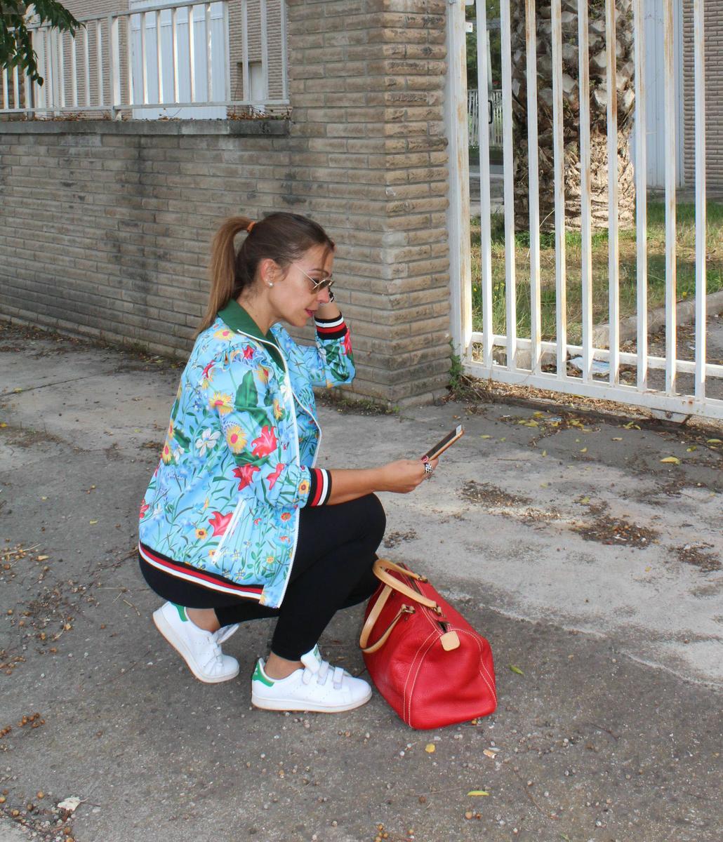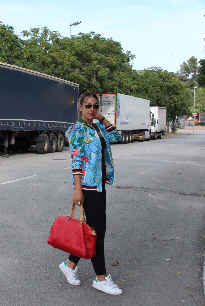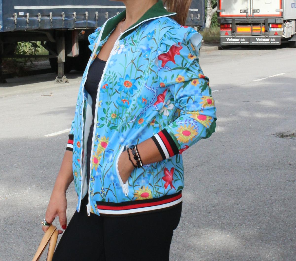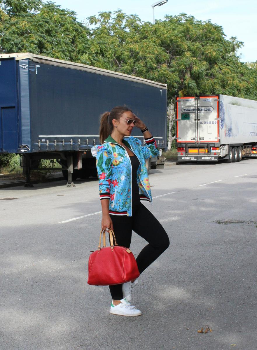 Mi look de hoy, es un look muy sencillo, la base es un total black compuesto por prendas básicas, como son unos leggins y una camiseta, y la parte colorida la pone la chaqueta con un print floral de SHEIN, adornada con pequeños volantes en la zona de los hombros y con un vistoso elástico en los puños y en la parte baja, con una clara inspiración a las colecciones de Gucci.
