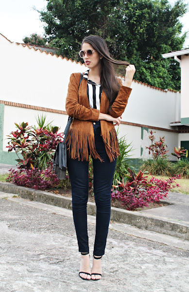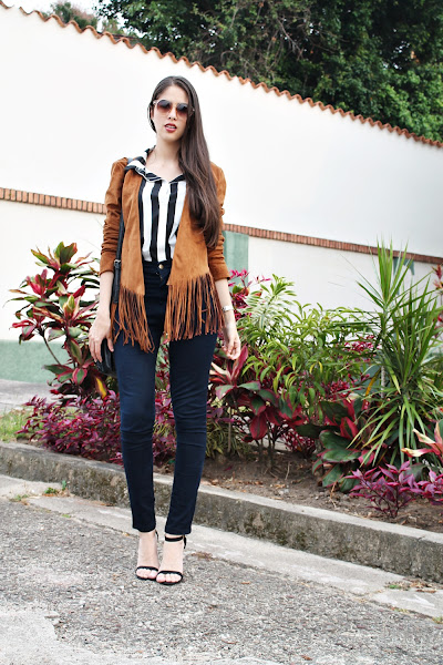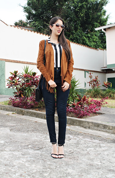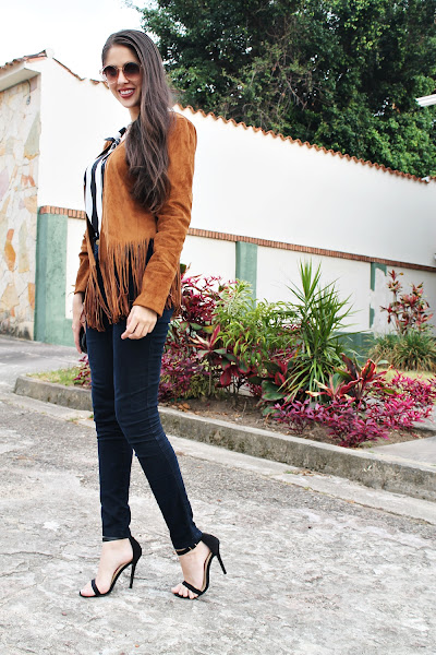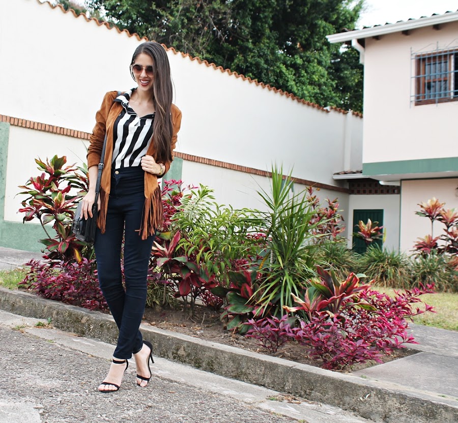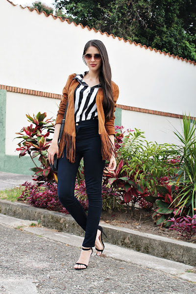 Y hablando de mi outfit: Decidí utilizar esta nueva chaqueta de flecos con una camisa de rayas gruesas y me encantó el efecto visual que dan ambas prendas, el resto es simple ya que quería que el protagonismo estuviera en la parte superior. Unos jeans básicos a la cintura, sandalias negras, una cartera estilo mensajera y lentes de sol.