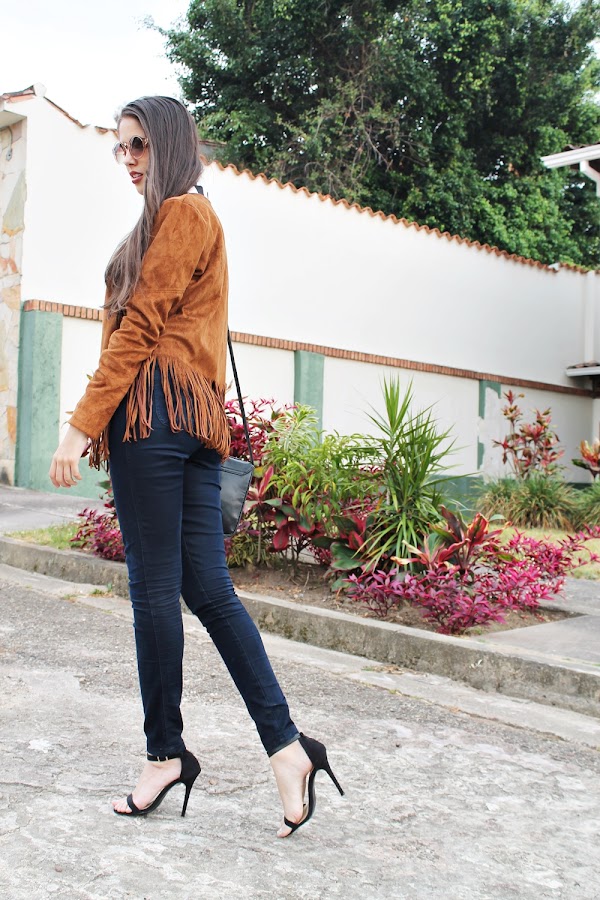 Chaqueta de Flecos: Rosewholesale / Camisa: H&M / Jean: Wholesalebuying /Sandalias: Zara / Cartera: Balu / Lentes: Closet de Alexa