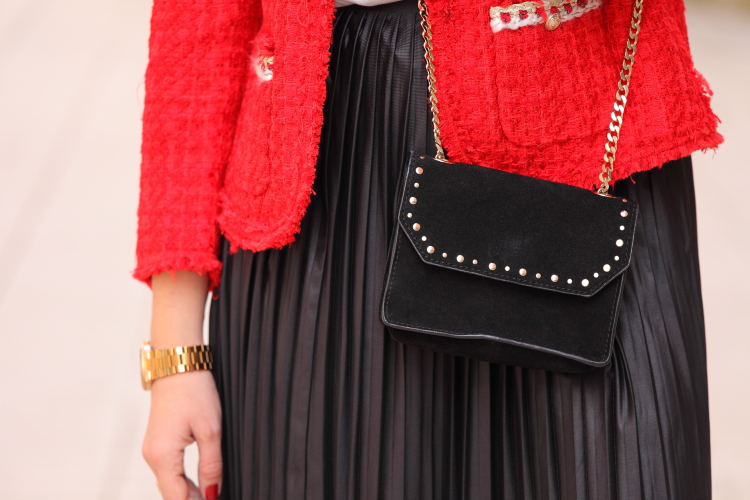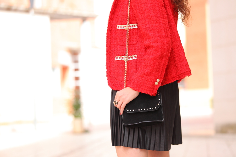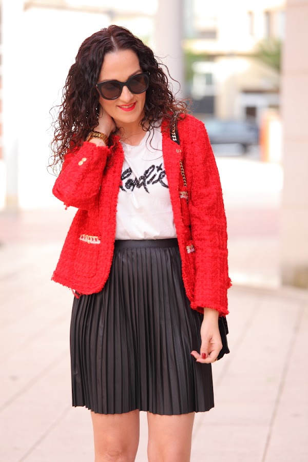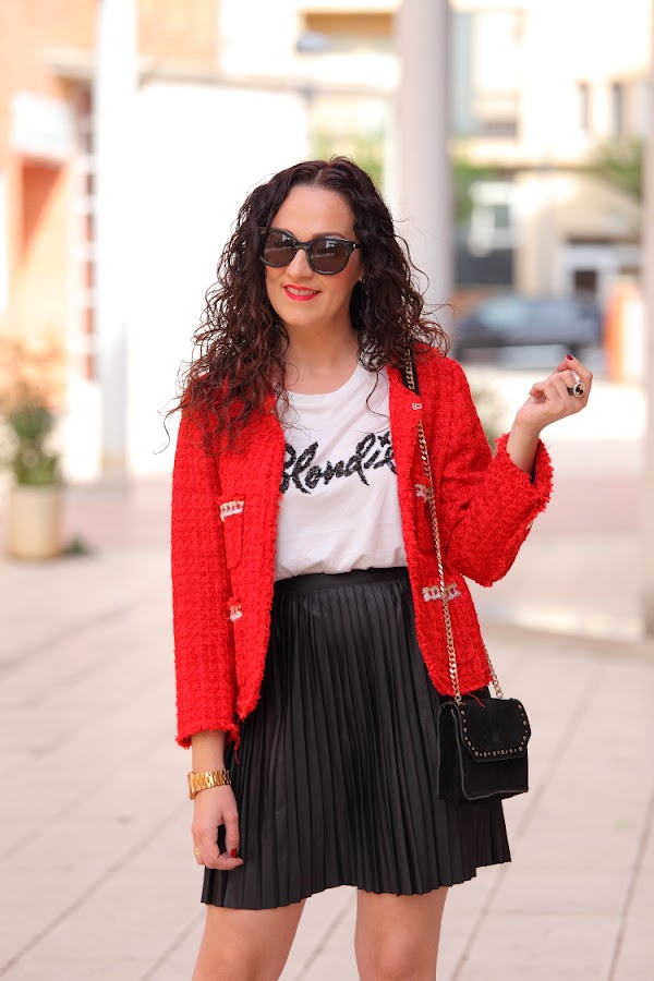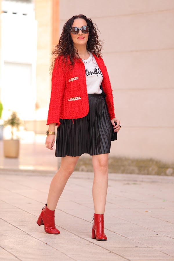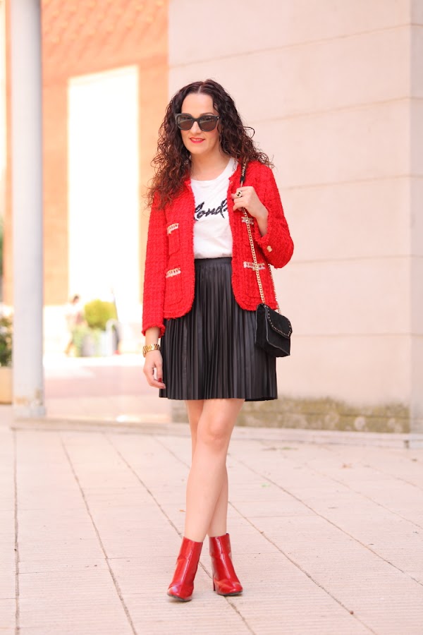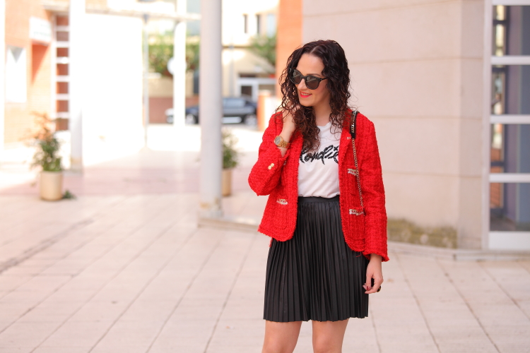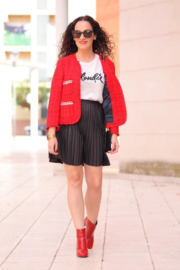El tweed es un tejido que me chifla para el invierno. Sobre todo me gusta llevarlo en chaquetas ya que te permite crear looks de todo tipo, desde arreglados a más informales. En las rebajas del verano encontré esta chaqueta tiradísima de precio y la guardé hasta que llegó el clima apropiado para lucirla. Las fotos que os enseño hoy son del otoño, cuando amanecían días más cálidos que permitían dejar las medias en casa durante el día, pero no me ha importado publicarlas ahora porque este outfit lo estoy llevando tal cual añadiéndole una buena media. Como veis, he combinado la chaqueta de tweed con una camiseta rockera y falda plisada. Un mix diferente pero que me gusta ¿y a vosotras?.