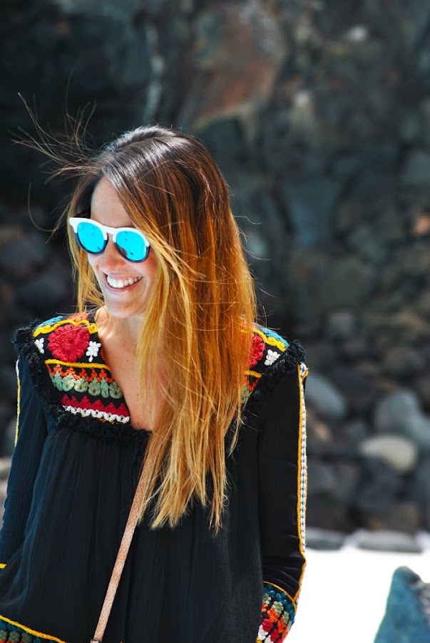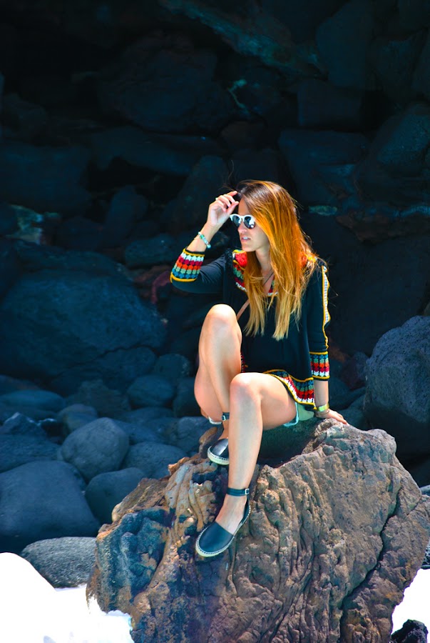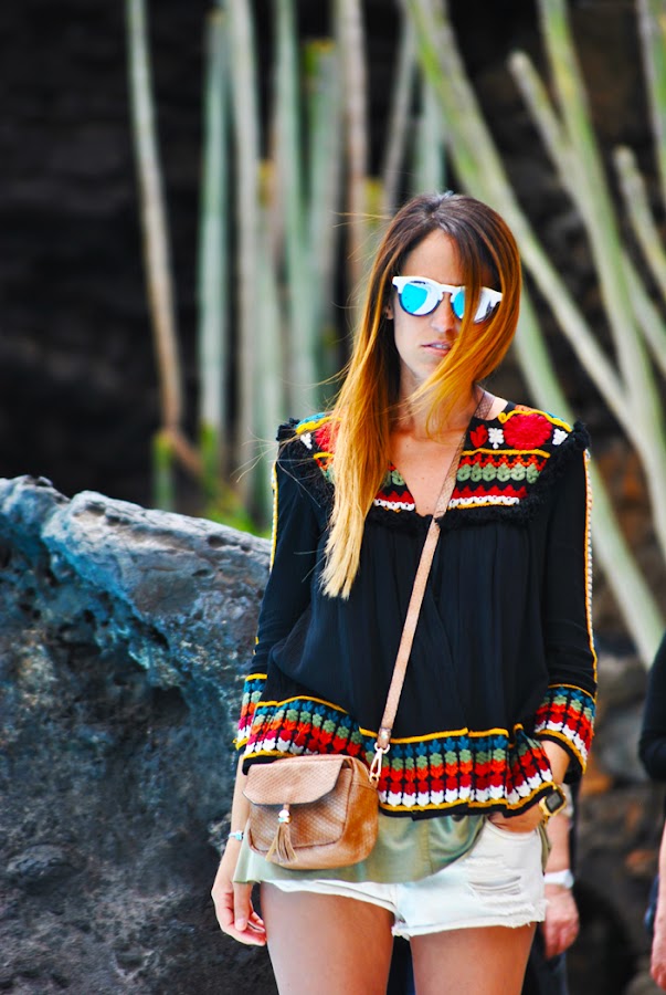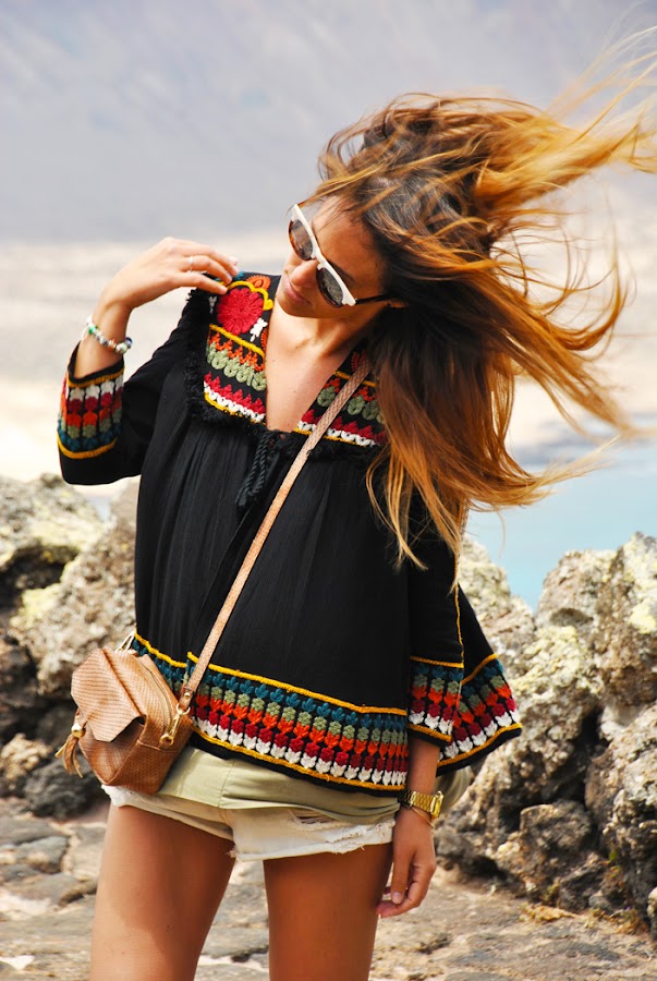 El look tiene como prenda estrella la chaqueta étnica de Zara. Esta chaqueta negra de algodón con adornos bordados y de colores intensos es mi prenda comodín de la temporada pasada y que tantas alegrías me ha dado durante todo el año y es que tiene la propiedad de convertir en boho todo lo que toca... una maravilla! La combiné con shorts en tono beig y top fluido verde. Como complementos mis nuevas espardeñas con doble pulsera y un mini bolsito marrón con estampado animal.