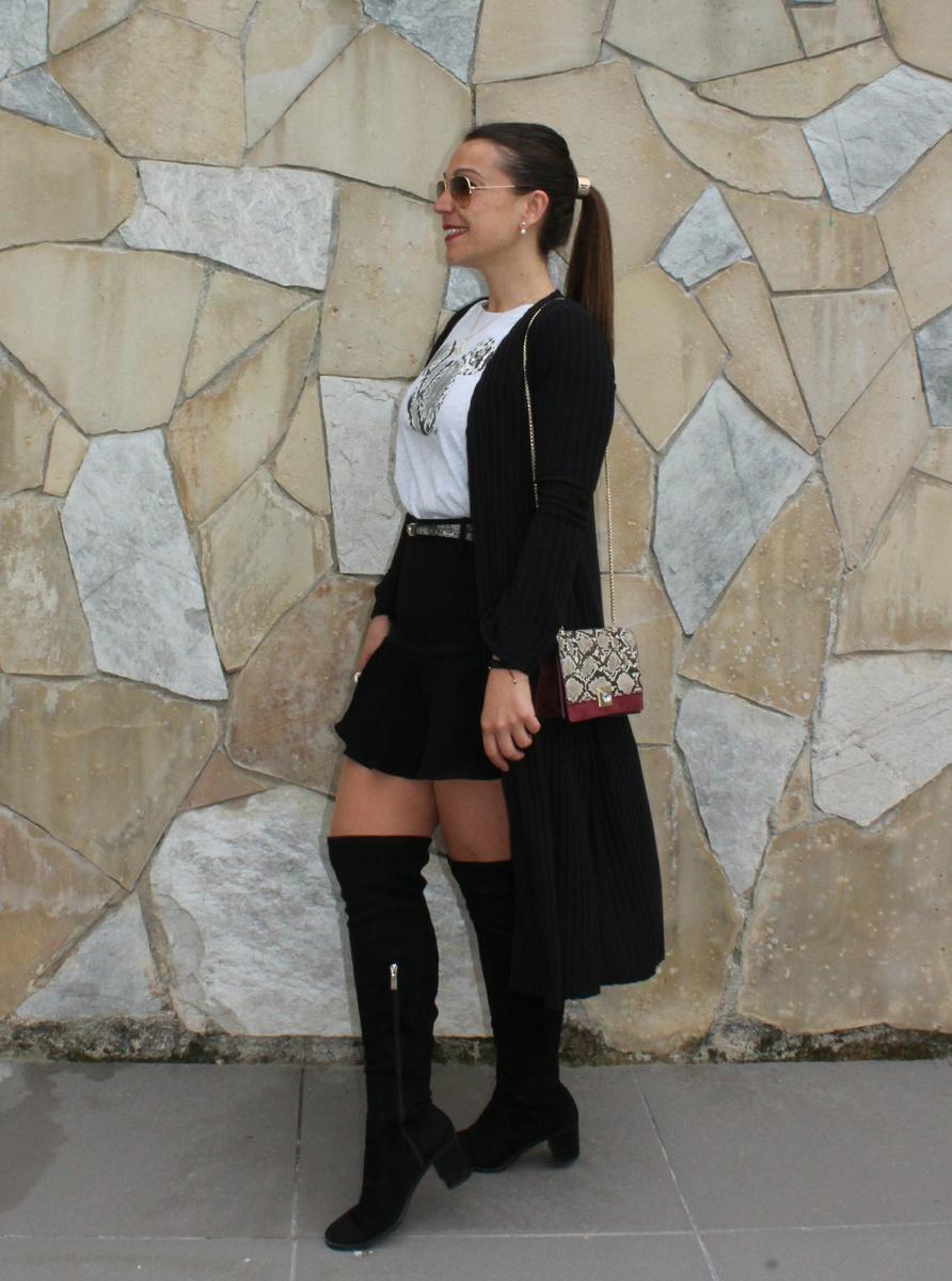 El resto del look se compone de una camiseta básica con la cabeza de Mickey en estampado de serpiente que combina con el cinturón de la falda pantalón y el bolso. Falda pantalón negro y botas por encima de la rodilla.