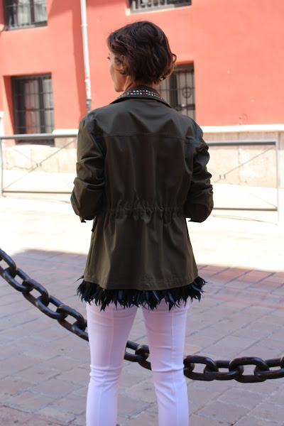 No lo puedo evitar: llega mayo y las mangas cortas y los tirantes pelean por salir de mi armario a la calle. Y, claro, en ciudades como Granada la amplitud térmica es tan grande que sobretodo al caer la noche necesitas una chaqueta en condiciones. Así que esta de Pinko que vi en Aracné me pareció perfecta. Porque tiene el aire militar que tanto se lleva desde hace años pero con un toque diferente por las tachuelas de colores y sobretodo las plumas del bajo, que me parecen ideales. Combinada con un top primaveral con hombros al aire y unos vaqueros de bajo irregular, creo que hacen un conjunto súper chulo para salir a tomar algo al caer la tarde.