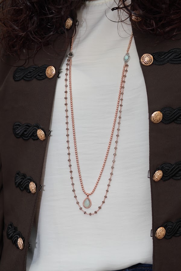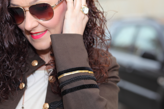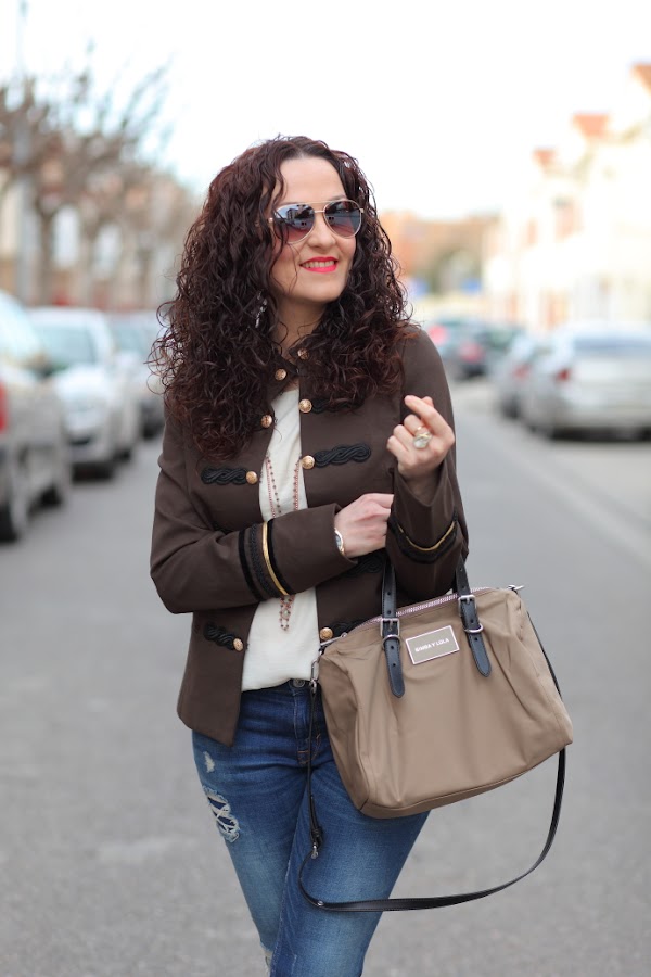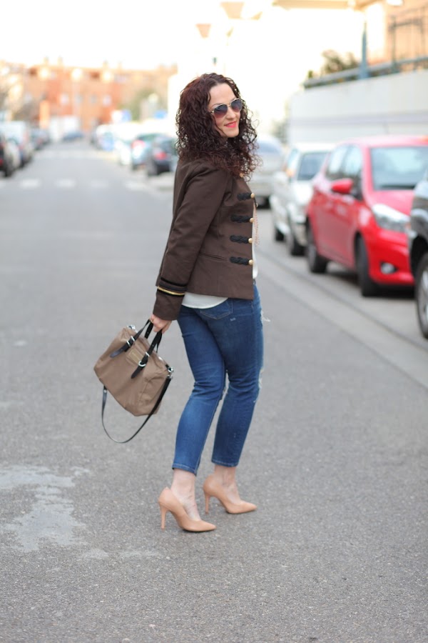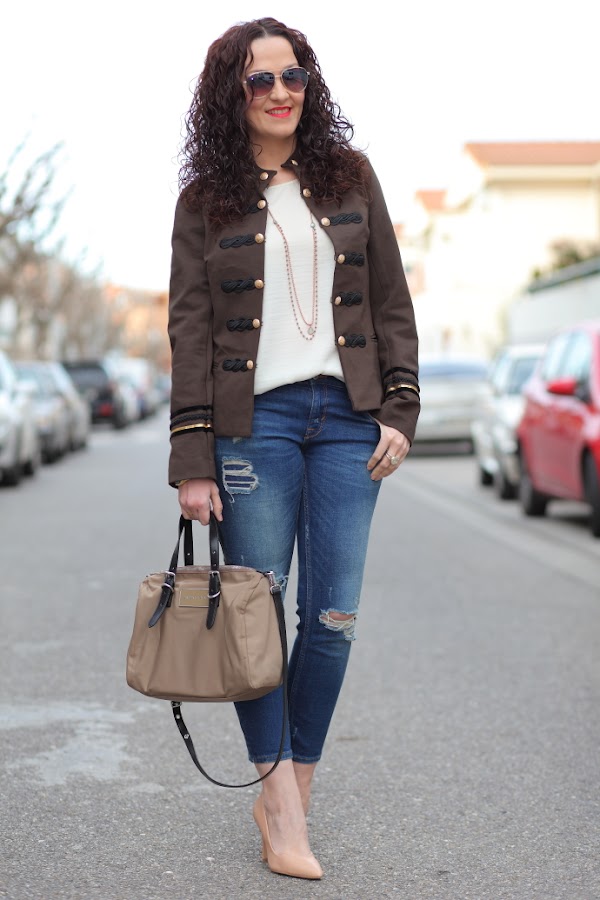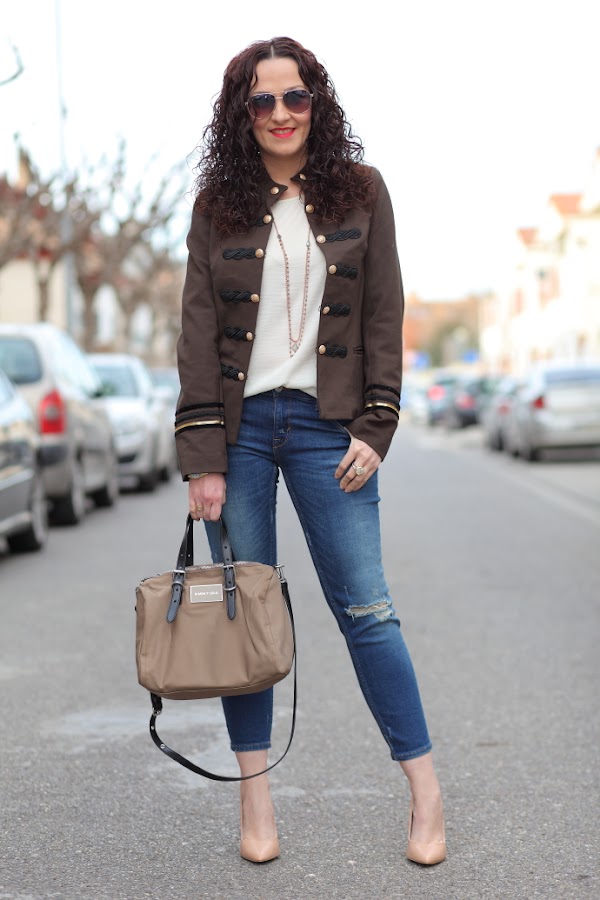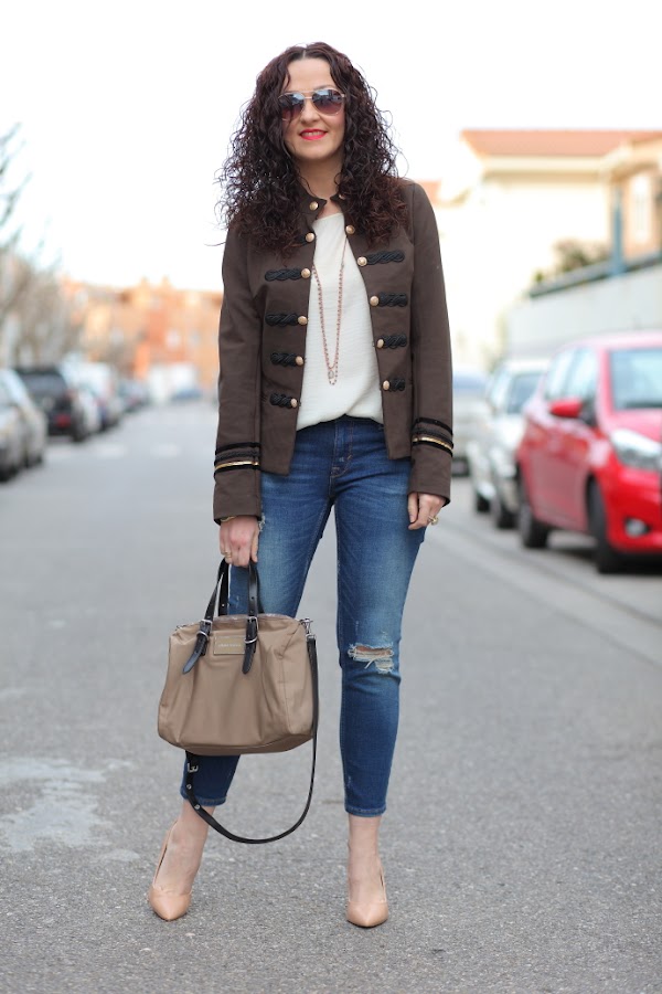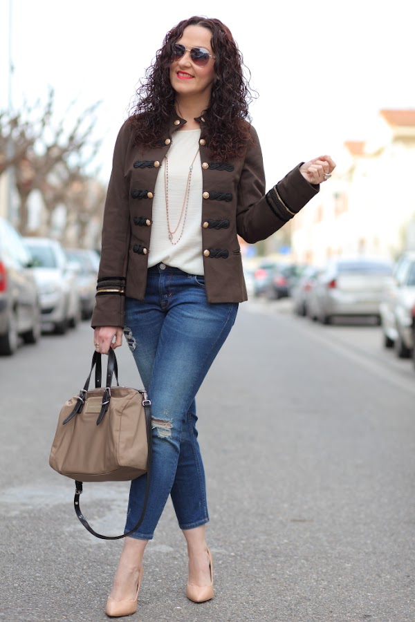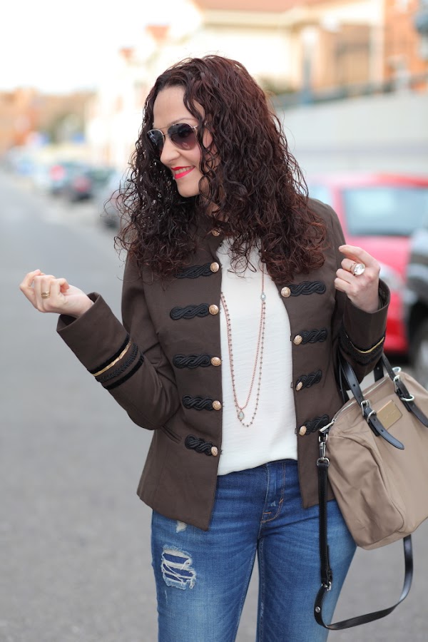 Esta temporada estoy encantada con las tendencias que tenemos, sobre todo las chaquetas de corte militar me chiflan. Poco a poco os iré enseñando las que me he comprado por ahora, para empezar os dejo con este look en el que llevo la primera que compré. Una chaqueta caquí que combiné con una blusa cruda, jeans tobilleros desgastados y una joyas compuestas por collar doble de cuentas y maxi anillo con piedra blanca.