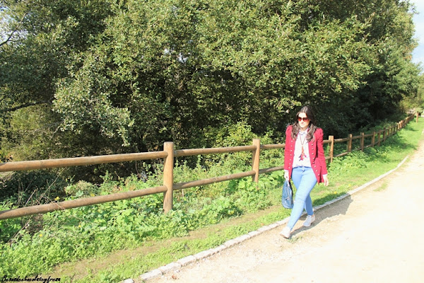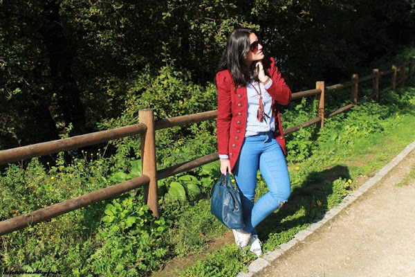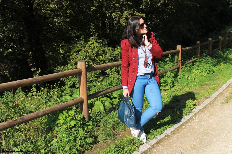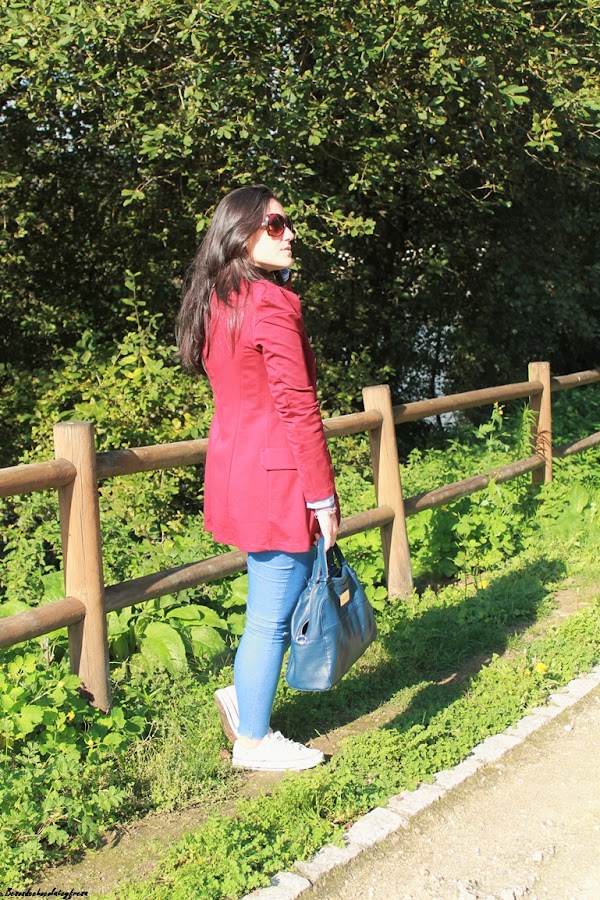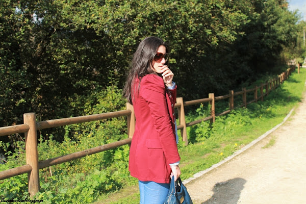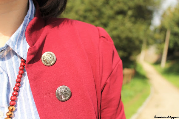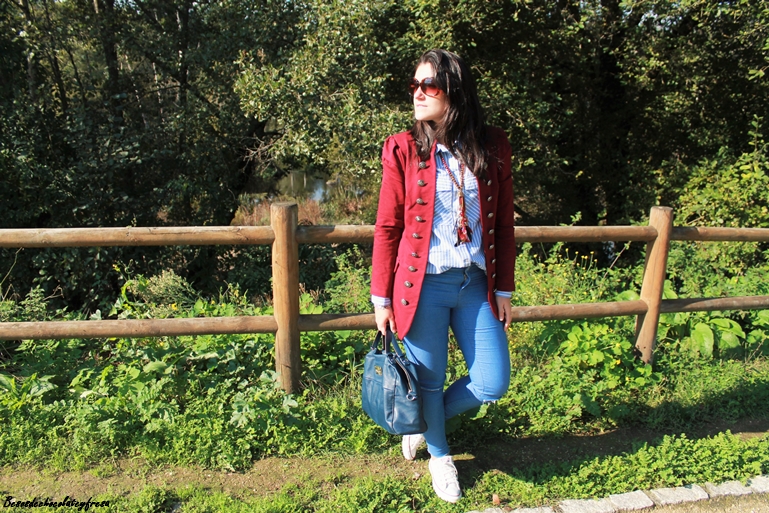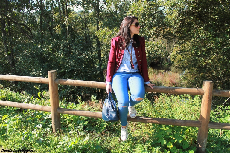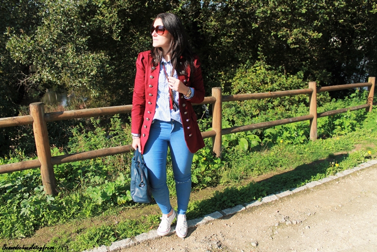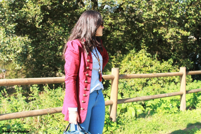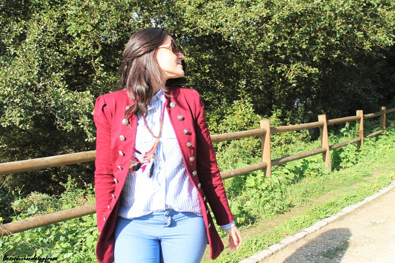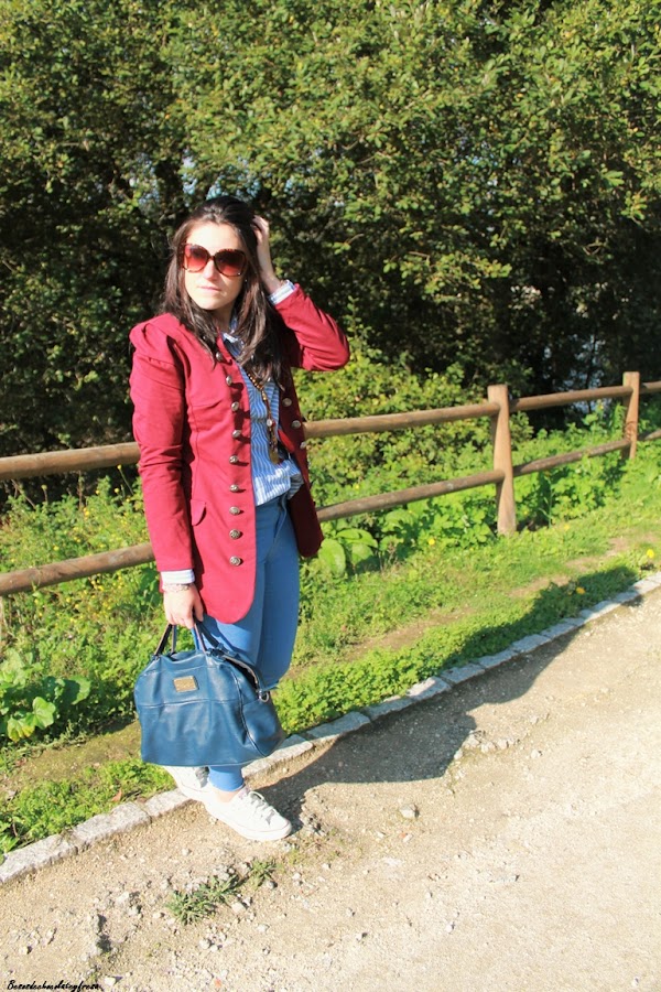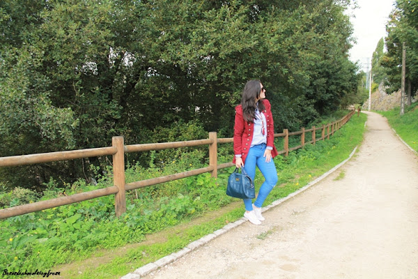 Hoy os muestro un look en tonos burdeos y azul, compuesto por chaqueta militar de mi tienda Besosdechocolateyfresashop, que sienta de vicio y para estos días que empieza a hacer algo de fresco viene genial.