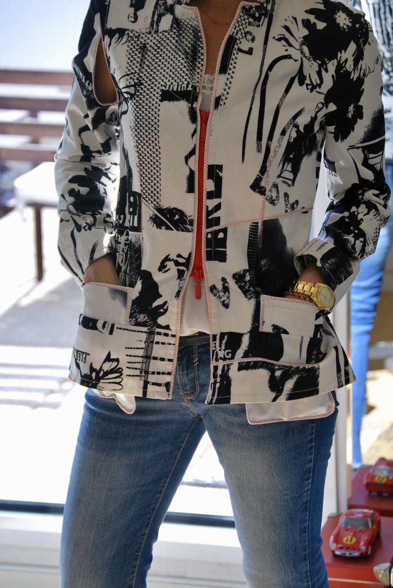 Me encanta la hechura que tiene, la combinación de colores; rojo, blanco y negro, el cierre con cremallera, los bolsillos que sobresalen por debajo, los “rotos” que tiene en las mangas, lo delicada y deliciosa que es y lo bien que queda.