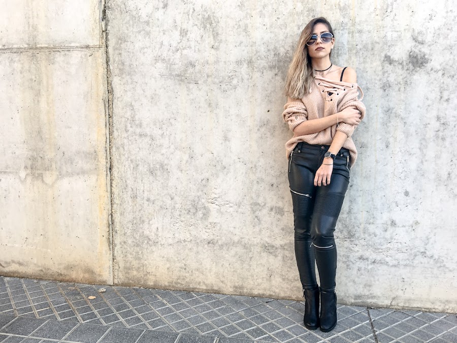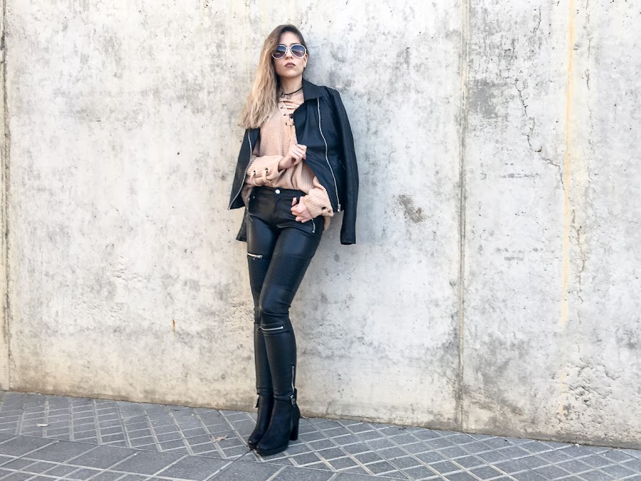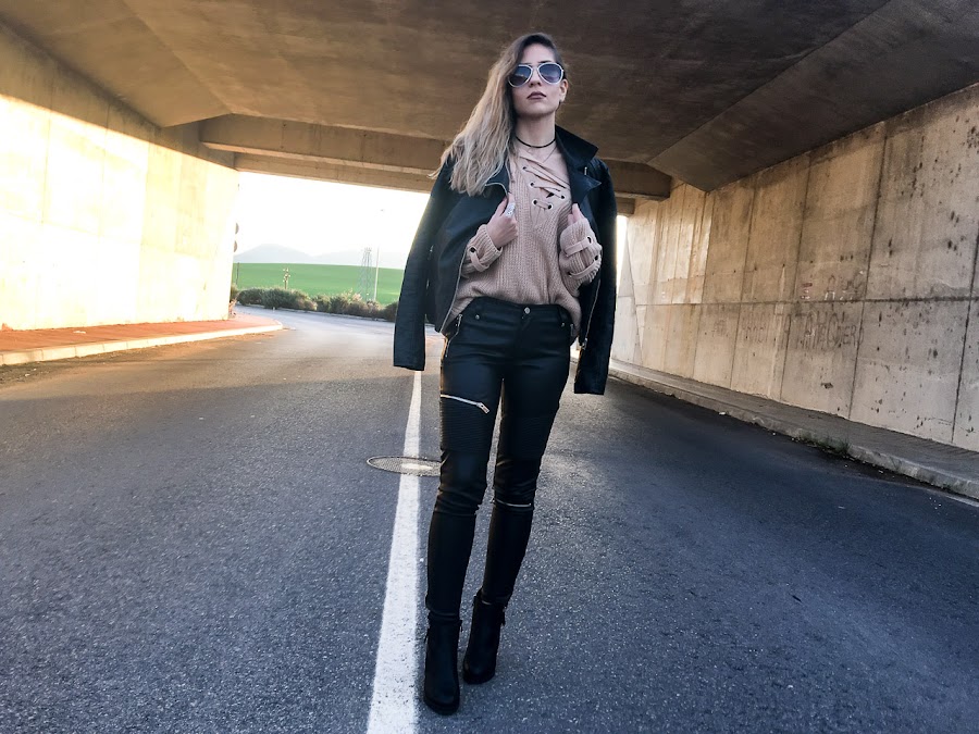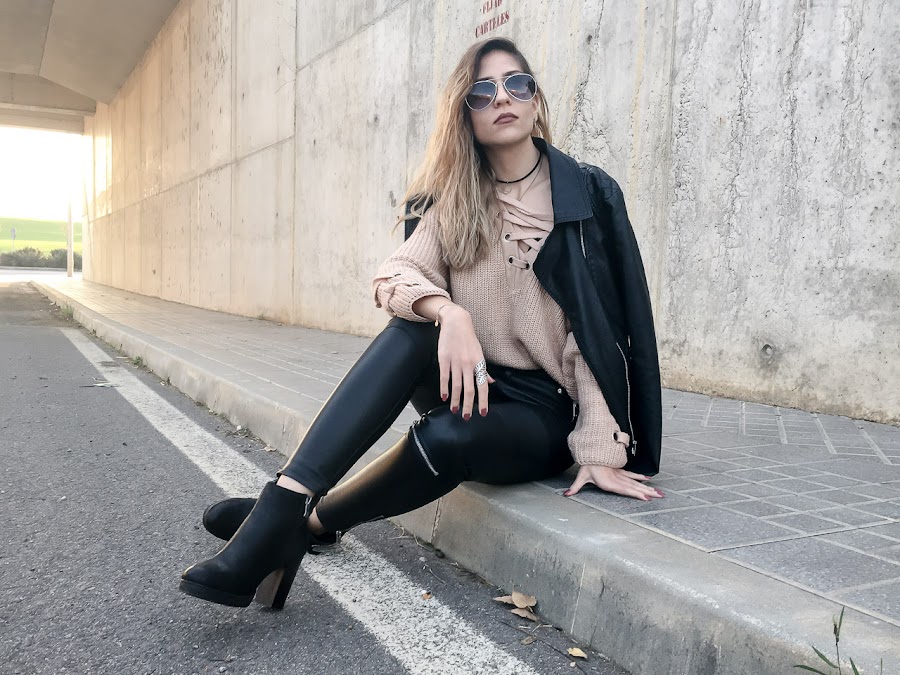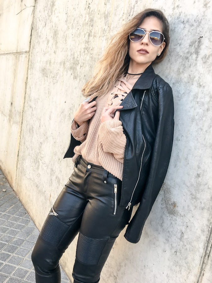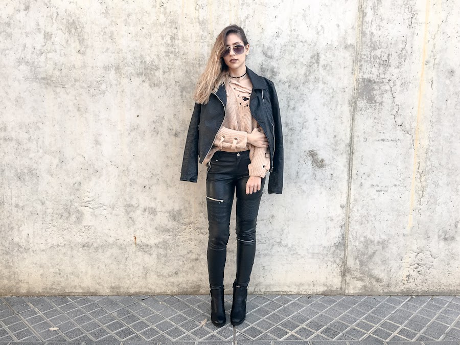 Lo he combinado con mi jersey oversize de cordones y mi chaqueta biker de cuero.
