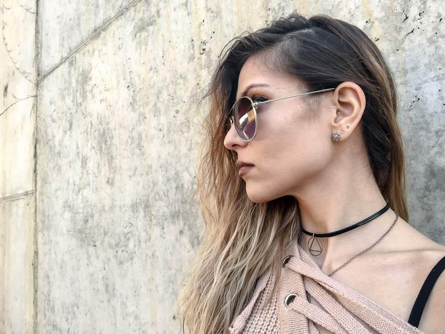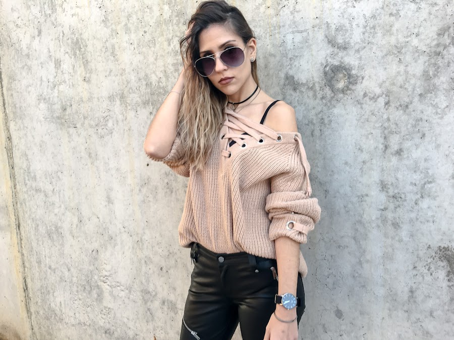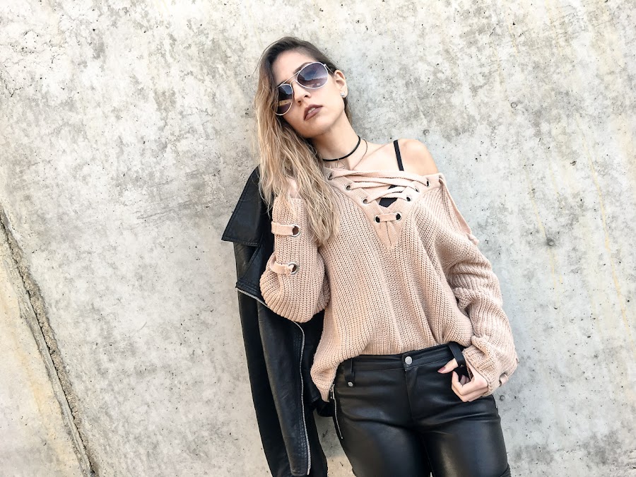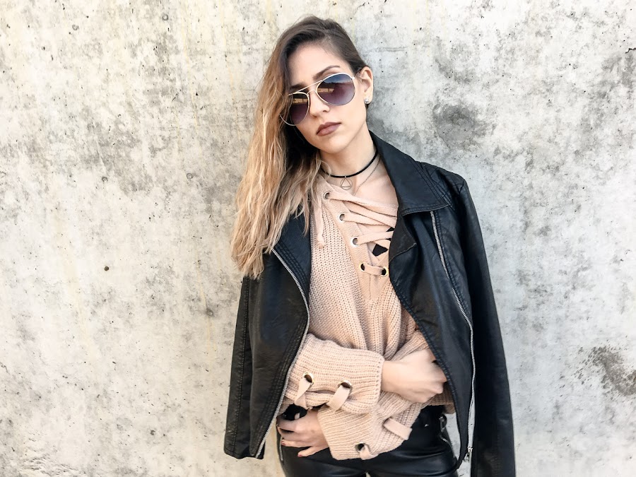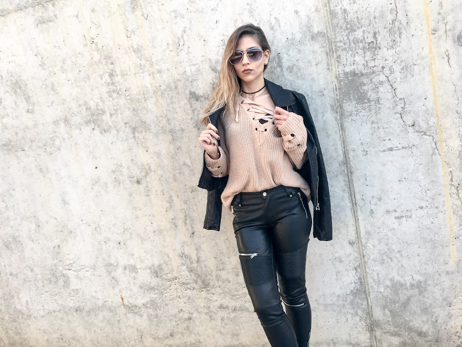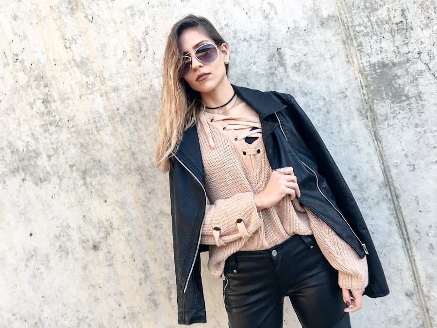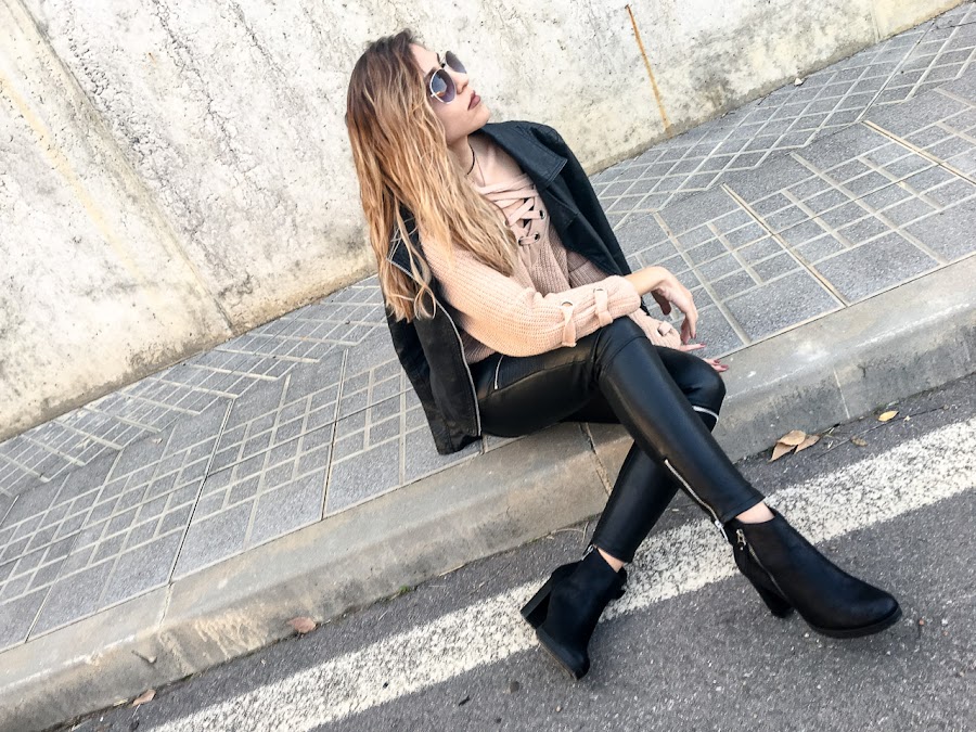 Lo he combinado con mi jersey oversize de cordones y mi chaqueta biker de cuero.