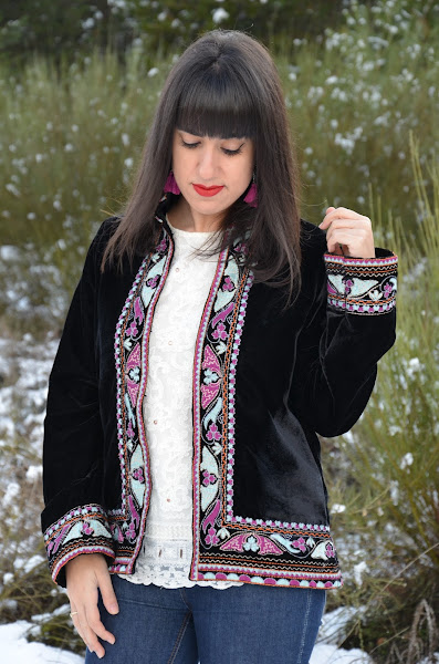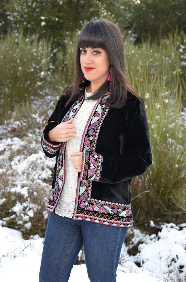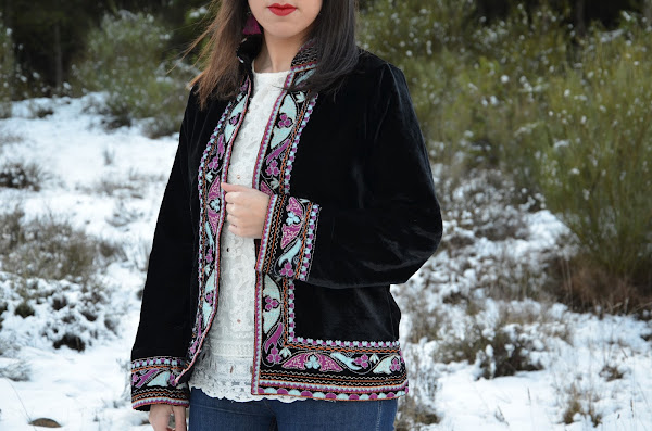 Es la CHAQUETA RHANIA, una auténtica maravilla. De terciopelo, de corte clásico con bordados de estilo étnico en preciosos tonos pastel. Sin duda una prenda de plena tendencia y única para ir elegantes y llamativas en invierno.