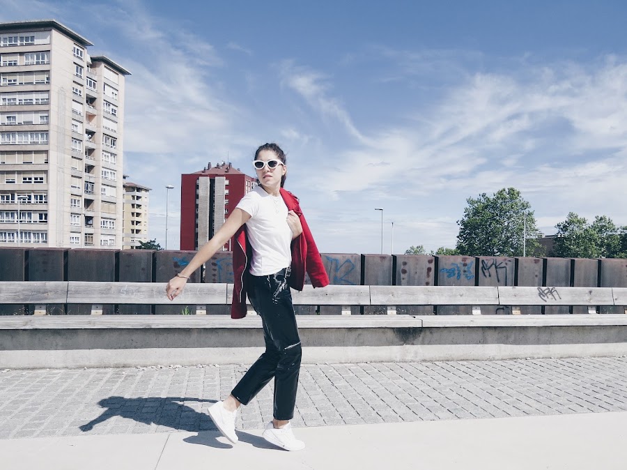 Esta vez yo jugué a combinar básicos (que siempre son un acierto), una camiseta básica blanca, lo acompañe con unas sneakers blancas del año pasado de NIKE y estos pantalones de vinilo que estos días de "entretiempo" (que sales y hace sol, luego llueve y después te congelas) son un acierto, estaban olvidados en el fondo de mi armario y la verdad que sientan genial.