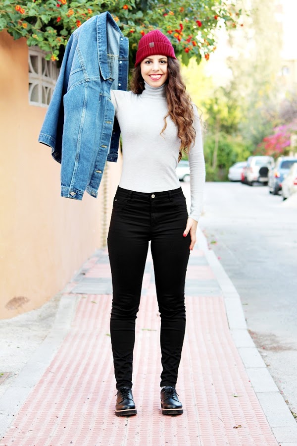 Hola cositas bonitas! Ayer debía de haber publicado esta entrada pero tengo un costipado bastante importante y no me moví en todo el día del sofá, hoy estoy algo mejor asique aquí estoy. El outfit de hoy es uno de mis favoritos. Prendas básicas pero dándole un toque guai con esta chaqueta vaquera oversize de Okeysi. Me encanta el color, la forma y su precio! La talla que llevo es la XS y me queda perfecta. La combiné con un pantalón negro elástico de Pull and Bear, una camiseta de cuello alto gris, también de Pull and Bear y mis zapatos masculinos negros de Bershka. El gorro es de Primark. Quizás haya demasiados colores pero me gusta jajaja. Os deseo un buen fin de semana. El lunes os espero aquí para enseñaros mi vestido de NocheViejaOs dejo los enlaces directos hacia las prendas debajos de las fotos.