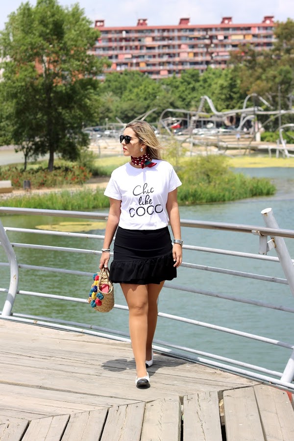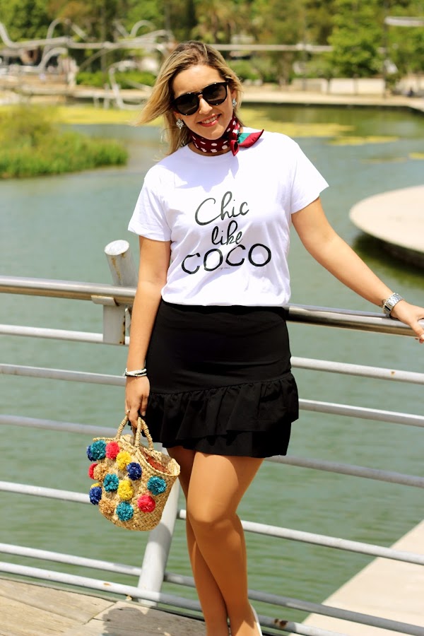 Hoy os traigo un look casual chic de esos que me encantan y son de esos looks, que nunca pasan de moda. En el look de hoy, llevo mi nueva falda negra con volante, que combiné con una camiseta blanca con mensaje y mi chaqueta tejana, que me parece perfecta para llevar en esta época del año. Para darle un toque chic al look, le añadí mi pañuelo de lunares y mi cesto con pompones, que es una de las tendencias de esta temporada. El resto de accesorios fueron mis manoletinas blancas y negras.