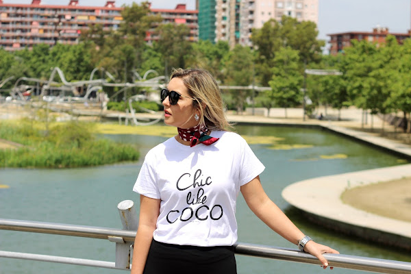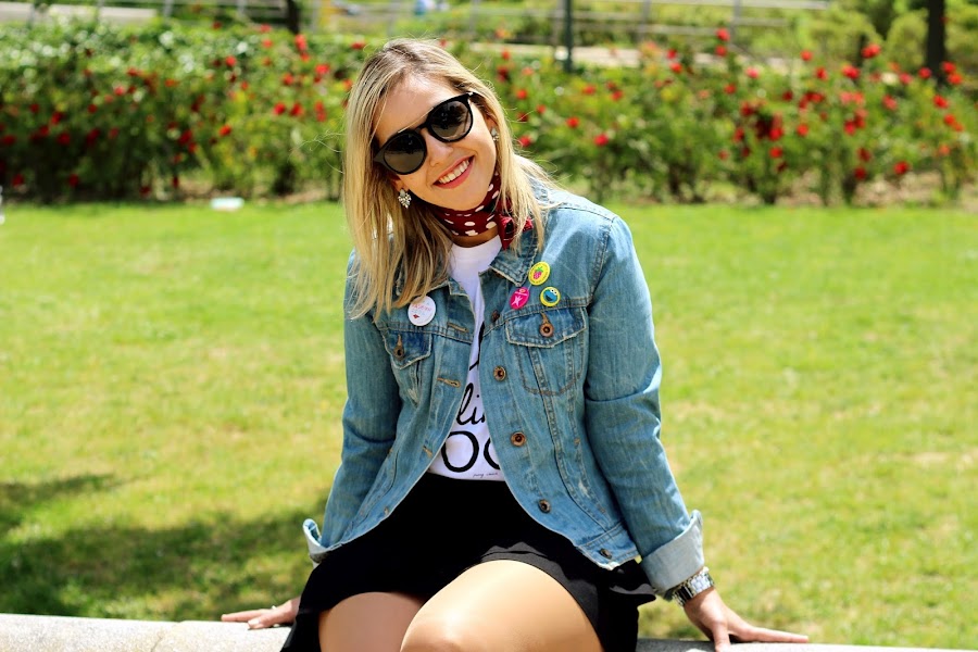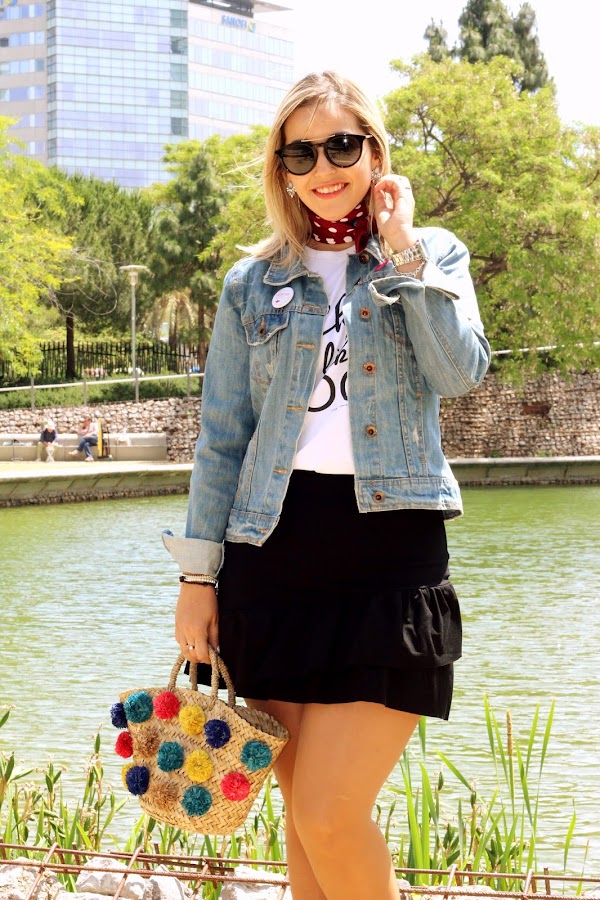 Today I show you a casual chic outfit that its the kind of outfits that I love and never goes out fashion. In the outfit of the day I wear my new black skirt with a ruffle with a white tee with a message and a denim jacket, which is perfect to wearing in this season of the year. To give a chic touch to the outfit, I added a foulard with polka dots and my pompons basket that its a trend this season. The rest of the accessories were white and black flats.