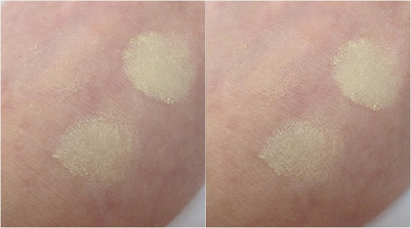 En esta foto os he dejo algunos chuaches del polvito de sus productos y tonalidades, jejeje. El que está a la izquierda (no sé si lo veréis...), es el "Concealer B", y a la derecha, de arriba-abajo, se encuentra "Corrector Gelb" y "05 Neutral Opaque Plus" (ésta, seguramente la veréis muy amarillenta, pero no es así en realidad..., ha sido por la luz, de cuando relicé la foto, de ese día). Cómo podéis observar, con un poquito de polvito ¡cubren una barbaridad!.