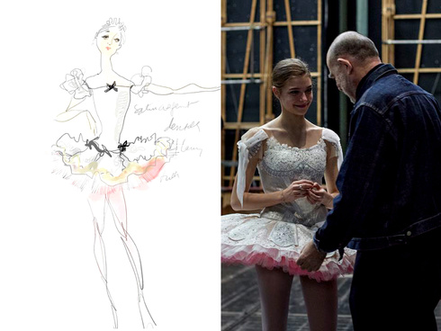 Para esta adaptacion, se realizaron, mas de 200 vestidos en terciopelo rojo o turquesa con mas de un millón de cristales de Swarovski destellando sobre el tul y las tiaras, también se contó con la donación de Sophie Hallette, la famosa casa de encaje y tul artesanal.