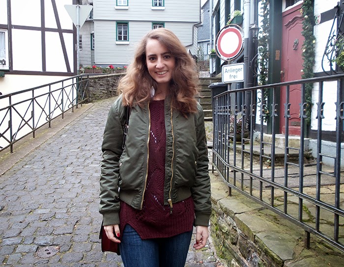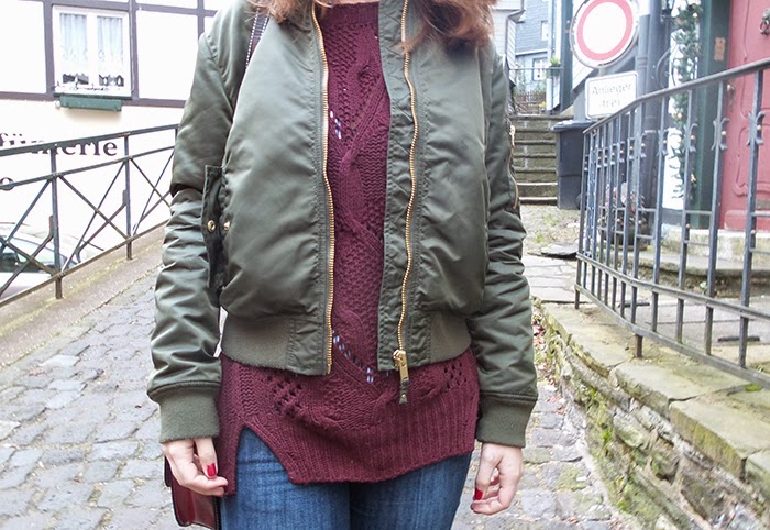 To spend the day walking around I chose a comfortable and warm look, in burgundy shades contrast with the green bomber jacket, key piece from the outfit.