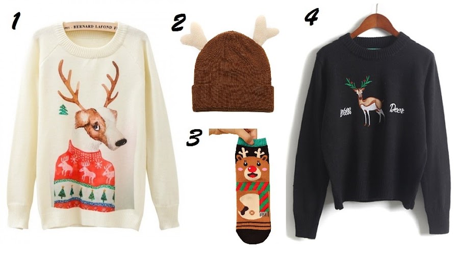 1- Jersey reno AQUÍ, 2- Gorro cuernos AQUÍ, 3- Calcetines reno AQUÍ, 4- Jersey negro reno AQUÍ
