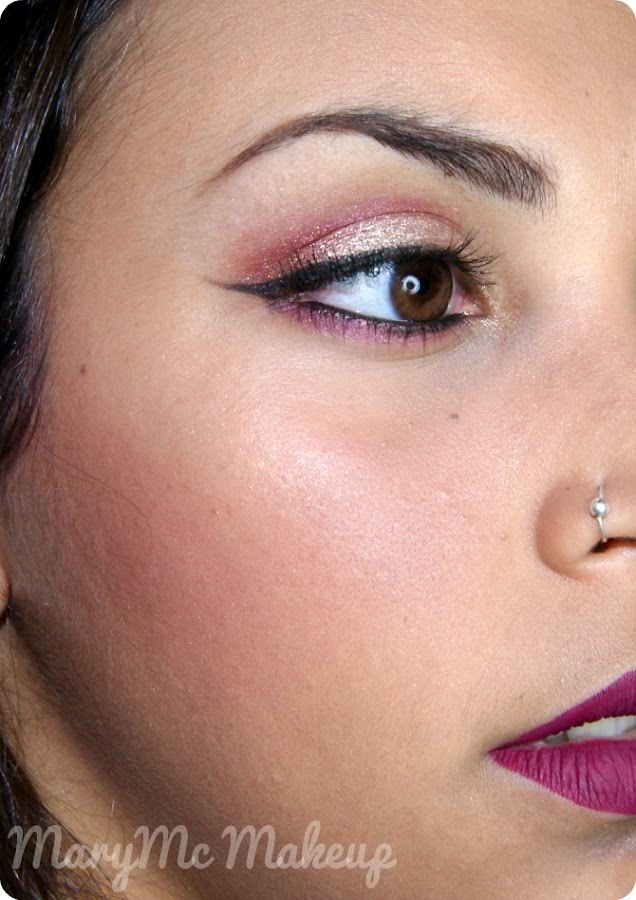 En el rostro llevo la base Fit Me de Maybelline en el tono 315, junto con el corrector HD de Nyx en los tonos Glow y Tan. Como colorete he usado uno de Yesensy (bazar) en un tono vino que os enseñaré próximamente, y como iluminador el Gotta Glow de Elf.