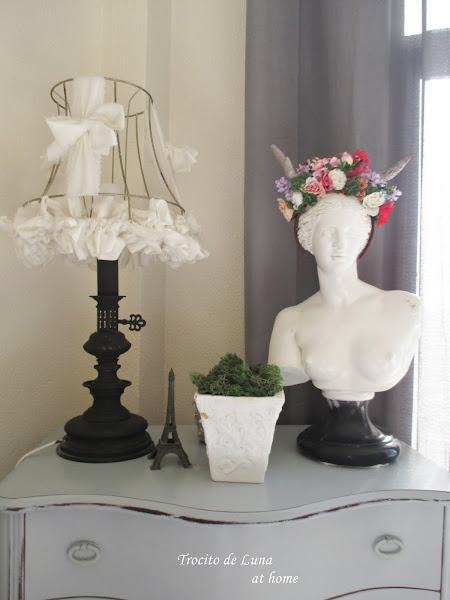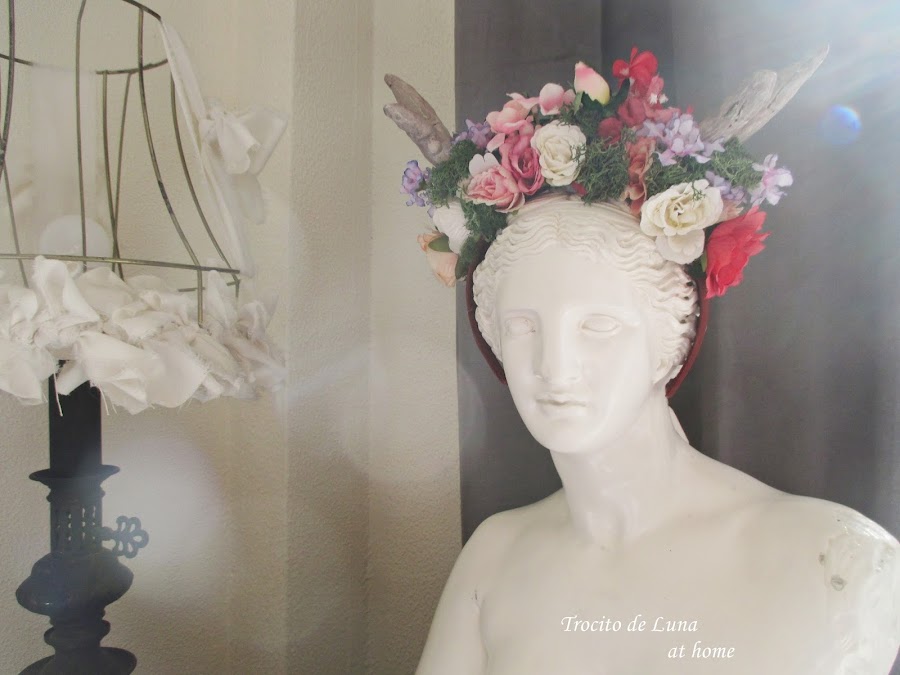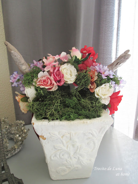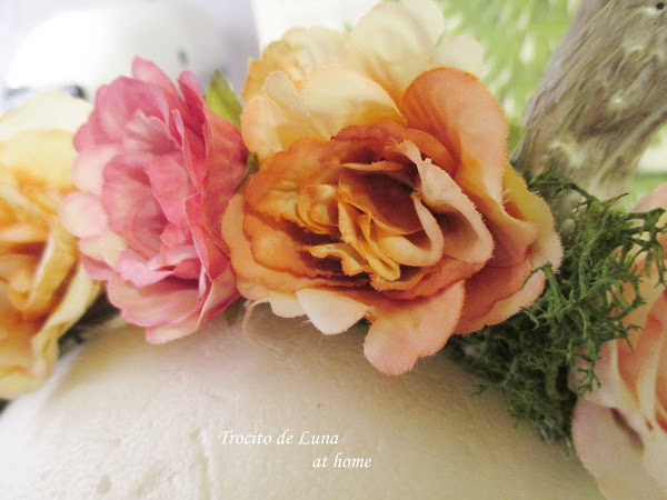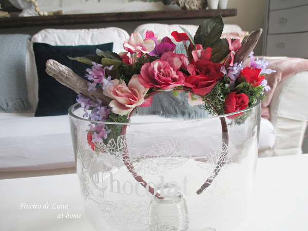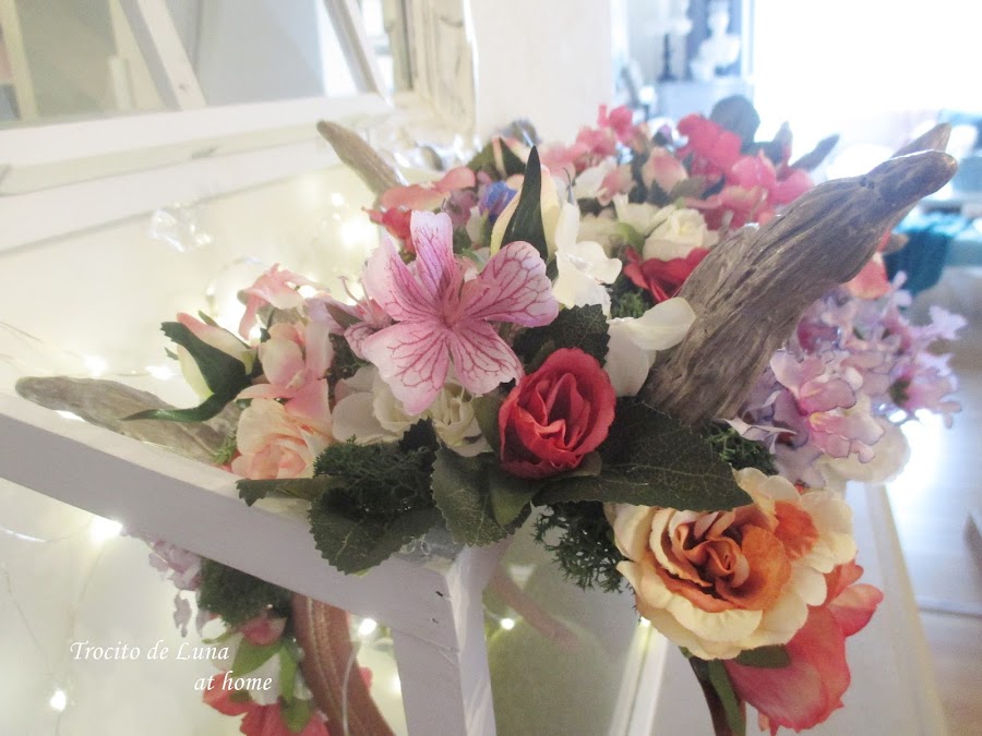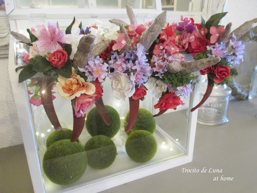 Una vez pegados los cuernos a la diadema con silicona, fuí intercalando flores, musgo, algunas hojas...