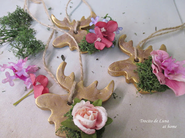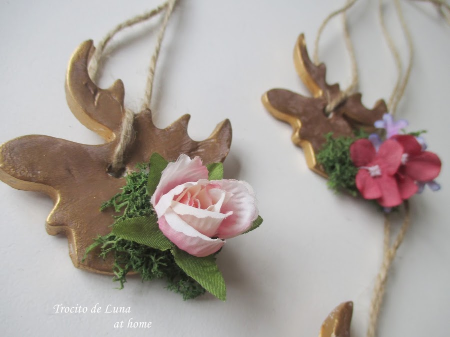 Los colgantes de reno quedaron muy chulos también en un tono dorado e intercalando musgo con alguna flor.