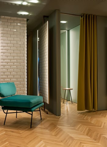 We love the floor and the wall´s finished, are pure texture and naturalness, and the spontaneous touches from the textiles in the seats and fitting room´s curtains. It´s an interior space with sparkle and grace, where even the furniture has a funny character and at the same time light and elegant.