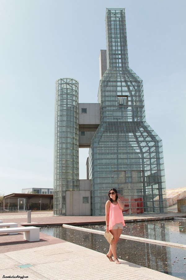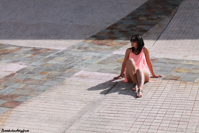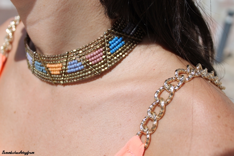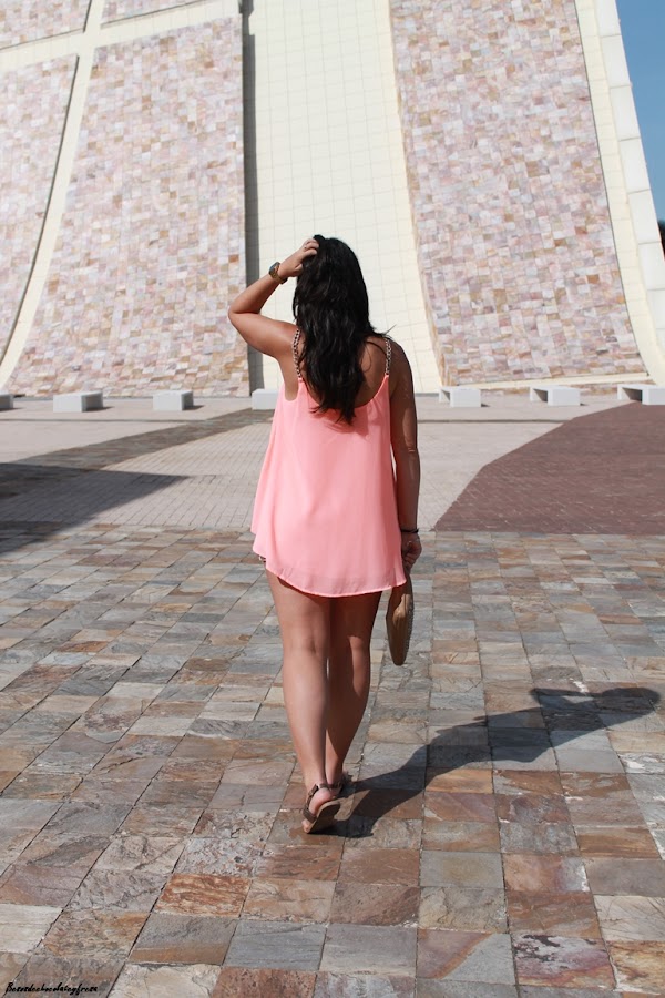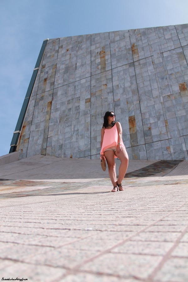 Para esta ocasión llevo blusón coral con tirantes de cadena, super fresquito, porque además hacía un día de mucha mucha calor, shorts en nude con pequeñas notas del mismo color y como complementos, sandalias en marrón, bolso nude y collar de abalorios. ¿Qué os parece?