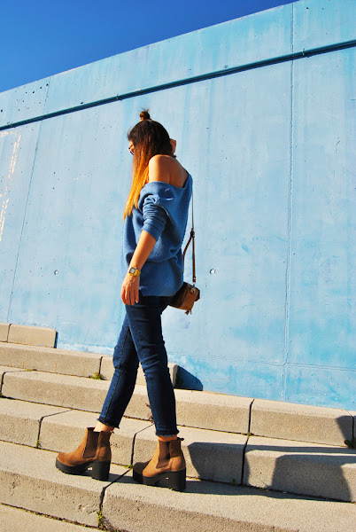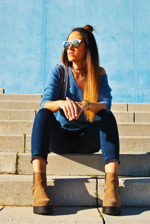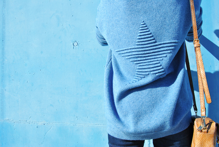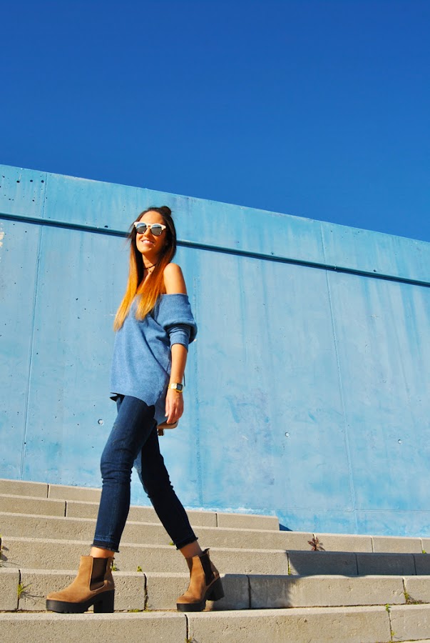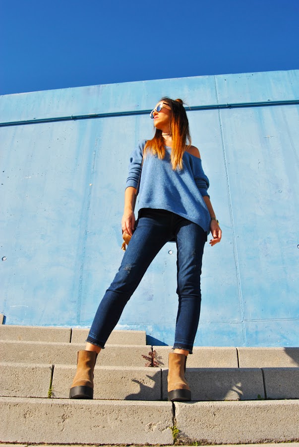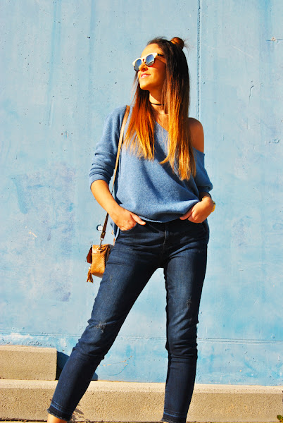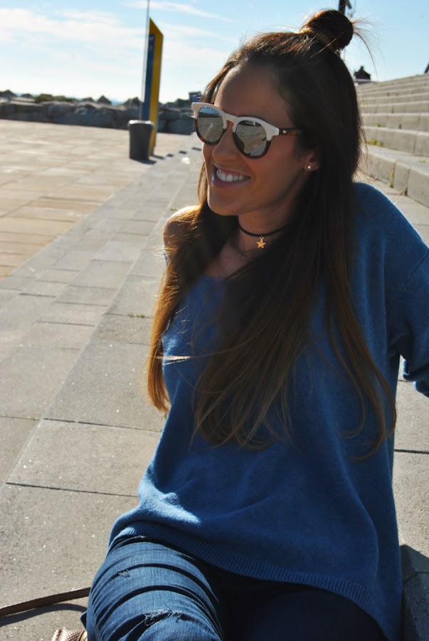 Bona tarda chic@s!! En el post de hoy os traigo un look comfy y desenfadado. Compuesto por jeans de tiro alto con bajos recortados y jersey azul de punto fino con tacto súper agradable que me compré una talla más grande para poder ponérmelo como veis, con el hombro al aire. El toque especial lo aporta la estrella en relieve de la espalda... y ahí va la excusa perfecta para hablaros de una de las últimas películas que hemos visto y que os quería recomendar, una obra maestra que no os podéis perder: LA LA LAND!!!