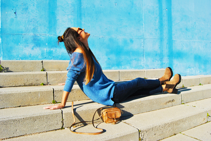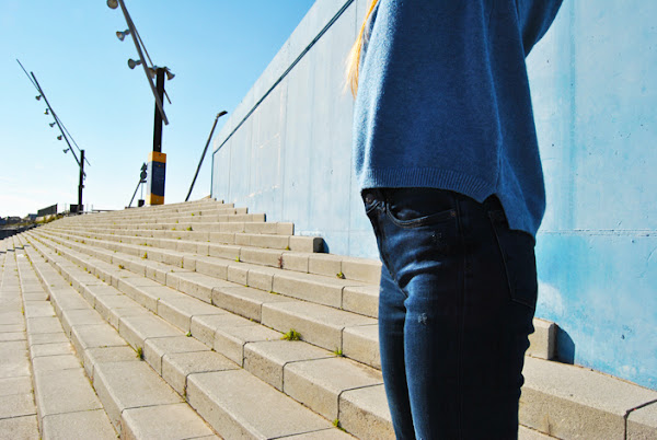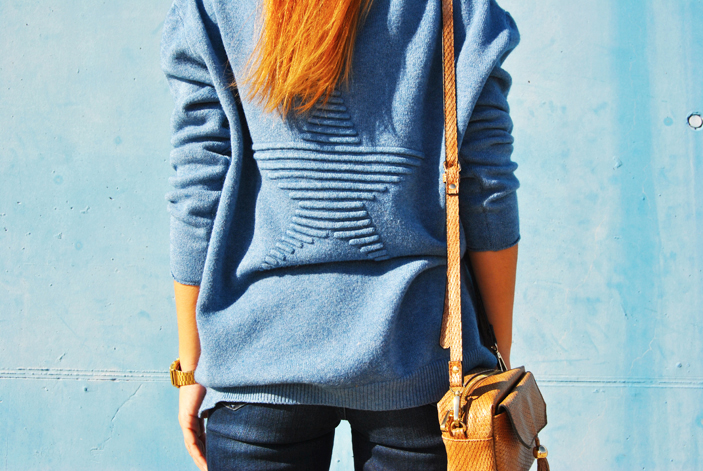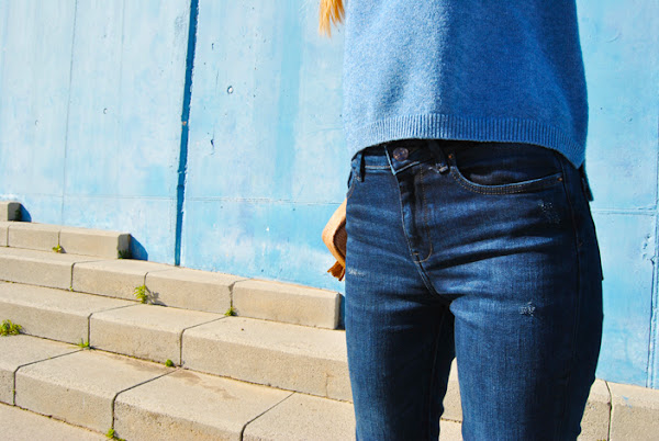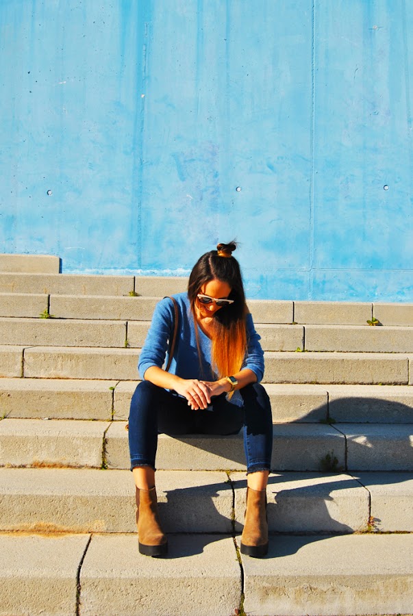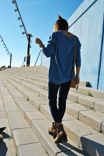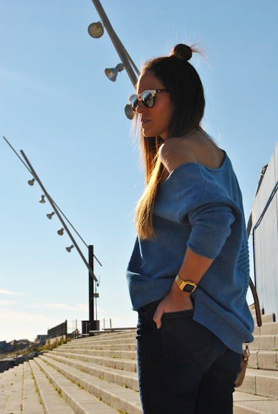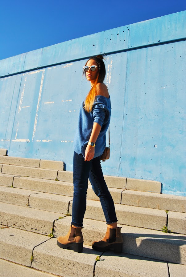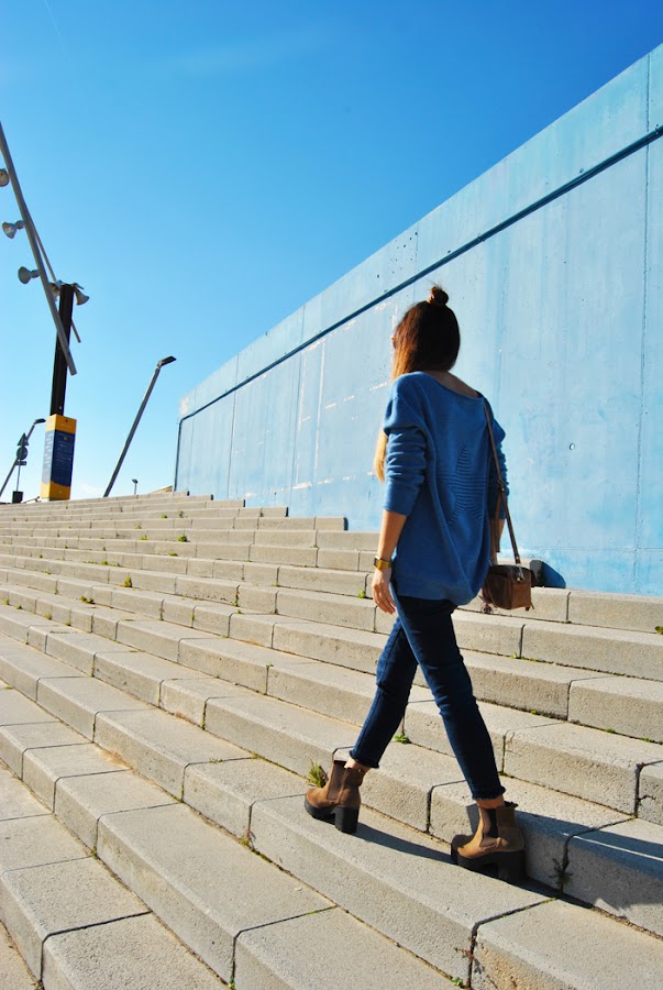 Bona tarda chic@s!! En el post de hoy os traigo un look comfy y desenfadado. Compuesto por jeans de tiro alto con bajos recortados y jersey azul de punto fino con tacto súper agradable que me compré una talla más grande para poder ponérmelo como veis, con el hombro al aire. El toque especial lo aporta la estrella en relieve de la espalda... y ahí va la excusa perfecta para hablaros de una de las últimas películas que hemos visto y que os quería recomendar, una obra maestra que no os podéis perder: LA LA LAND!!!