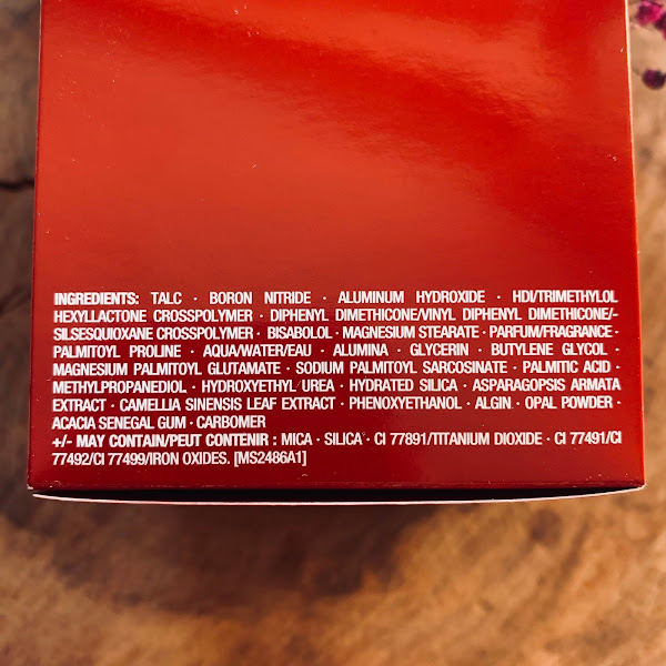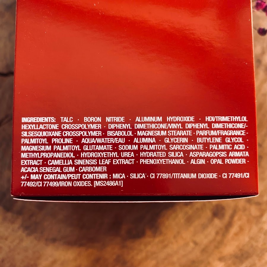 Talc, Boron Nitride, Aluminium Hydroxide, Hdi/Trimethylol, Hexyllactone Crosspolymer, Diphenyl Dimethicone/Vinyl Diphenyl Dimenthicone/Palmitoyl Proline, Aqua/Water/Eau, Aluminia, Glycerin, Buttylene Glycol, Magnesium Palmitoyl Glutamate, Sodium Palmitoyl Sarcosinate, Palmitic Acid, Methylpropanediol, Hydroxyethtl Urea, Hydrated Silica, Asparagopsis Armata, Extract, Camelia Sinensis Leaf Extract, Phenoxyethanol, Algin, Opal Powder, Acacia Senegal Gum, Carbomer.