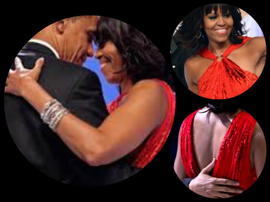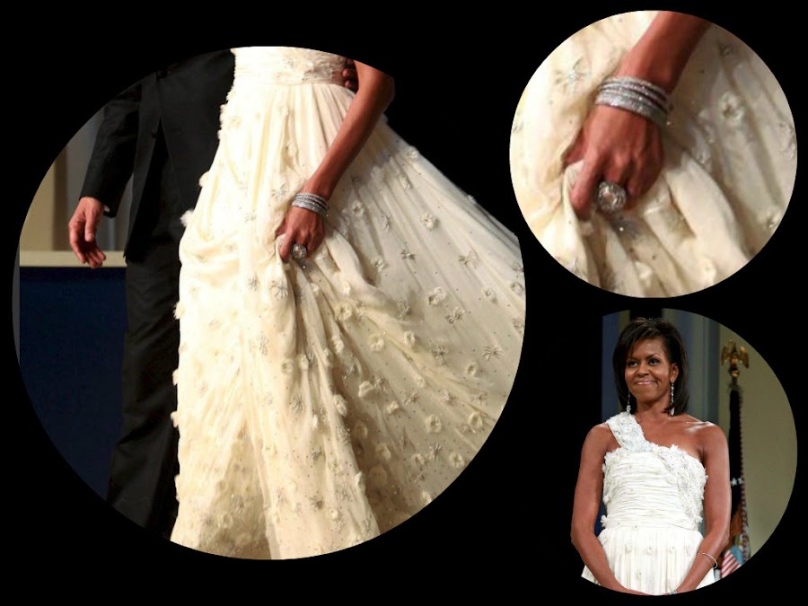 En 2009 el vestido que lució la primera dama de Estados Unidos, era de color blanco y tejido chifón con flores también blancas de gasa y pedreria, de corte romántico con cola y un hombro al decubierto. .