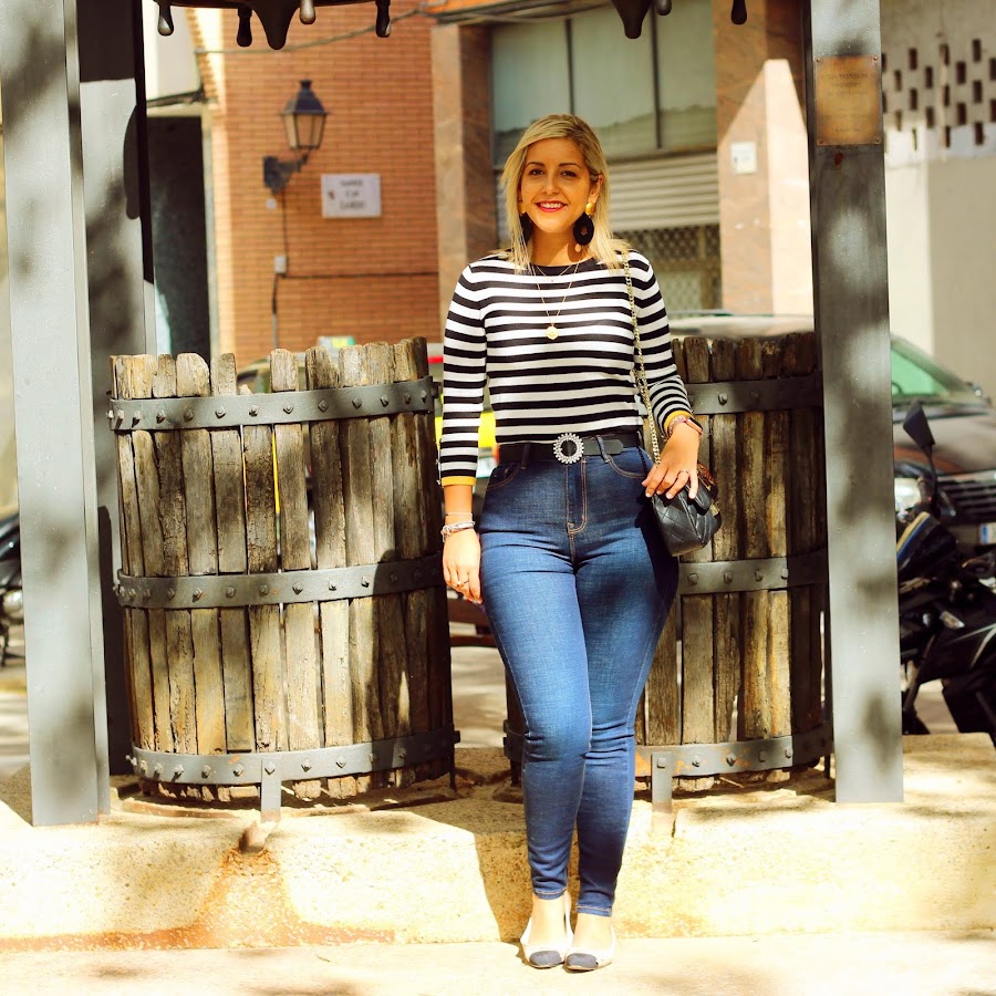 Hoy os enseño un look super básico que es perfecto para llevar esos días que no sabes que ponerte, y además, es el típico look que nunca pasa de moda y siempre vas arregladita y mona. En el look de hoy llevo mis nuevos jeans de talle alto que combiné un jersey de rayas que me compré en rebajas, ya que es una prenda básica que suelo llevar mucho en esta época del año. Los accesorios que escogí fueron unas manoletinas bicolor, mi bolso negro de parches, mis nuevos maxi pendientes negros y dorados y un cinturón joya que le da un toque chic al look.