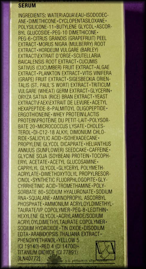 Este también tiene muchos ingredientes, espero que se vea bien, porque estas cajas tan brillantes son muy difíciles de fotografiar. Cuesta entre 50€ y 80€ los 30ml, todo depende de dónde miremos y caduca en 24 meses tras la apertura.