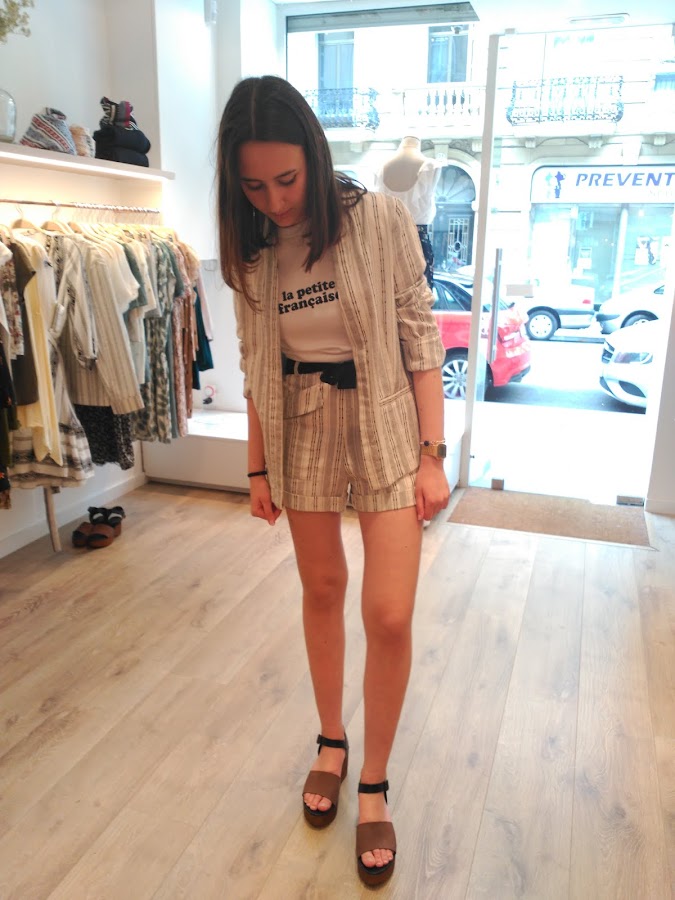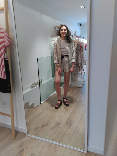 El primero, como podéis ver es un conjunto de pantalón y chaqueta. Opté por ponerme una camiseta básica con mensaje de las que se llevan mucho esta temporada. Y con la ayuda de Leire, decidí ponerme estos zapatos, que como bien me dijo ella estilizan muchísimo.