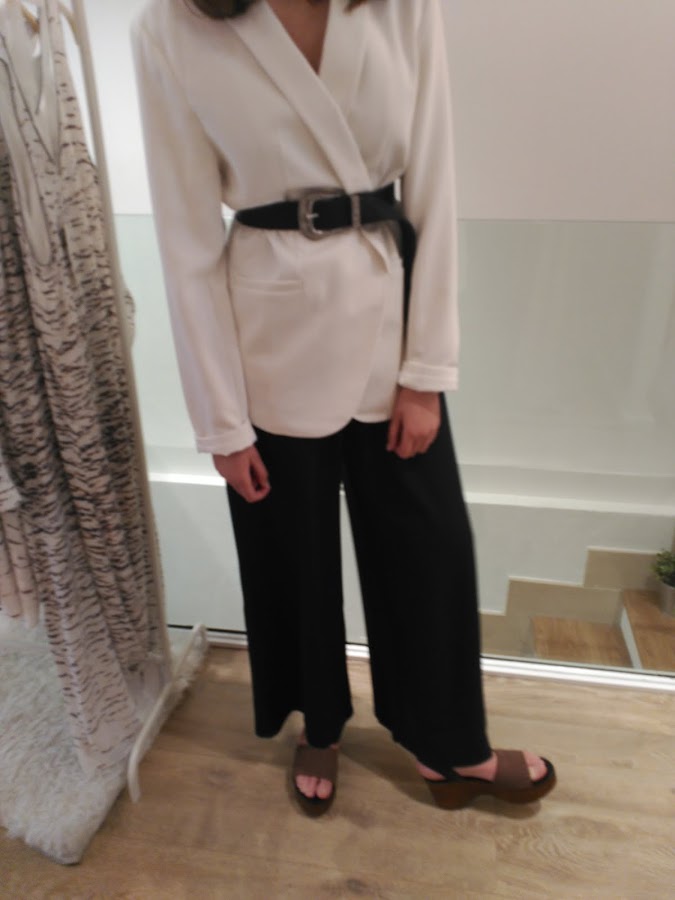 Para esto me puse un blazer blanco con un cinturón, unos pantalones palazzo que empezaron a llevarse el año pasado. Estos pantalones son muy ponibles para diferentes ocasiones.