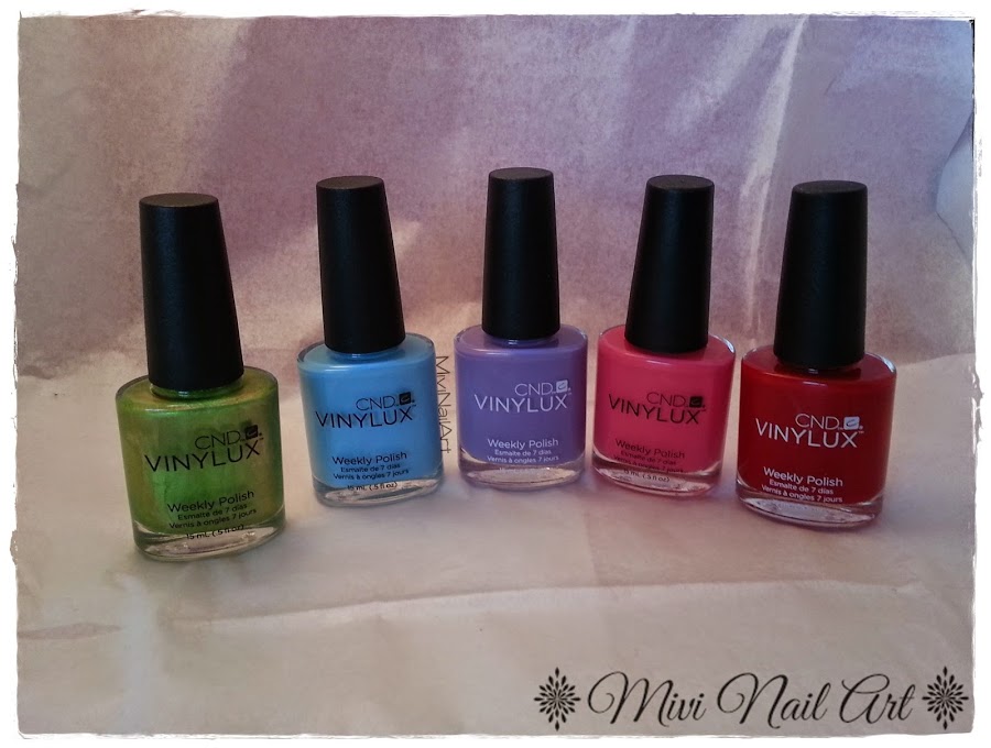 A continuación me enviaron 5 esmaltes y un top coat (que se me ha olvidado añadir en esta foto, pero que veréis en cada swatch). Son los esmaltes Vinylux, que se caracterizan por su larga duración, hasta 7 días sin descascarillarse, y además por no necesitar de aplicar ningún tipo de base previa... Vamos a verlos uno a uno.