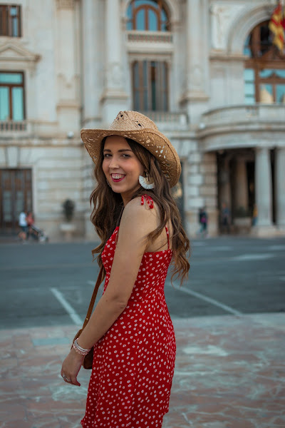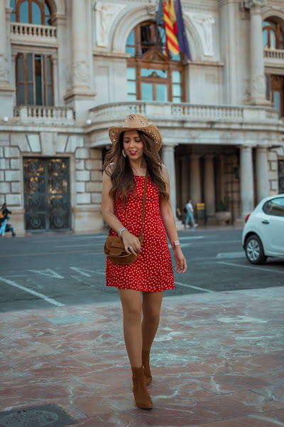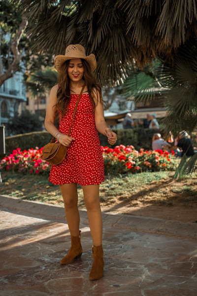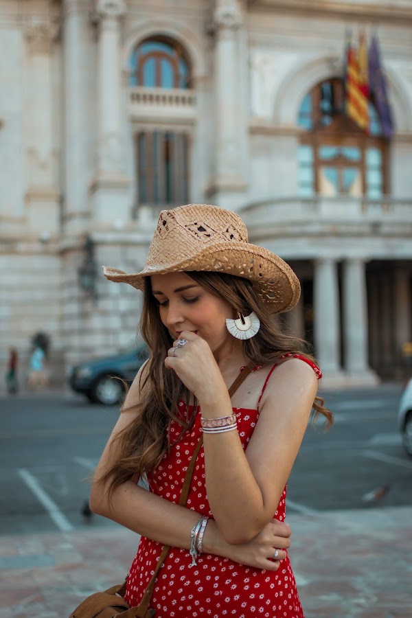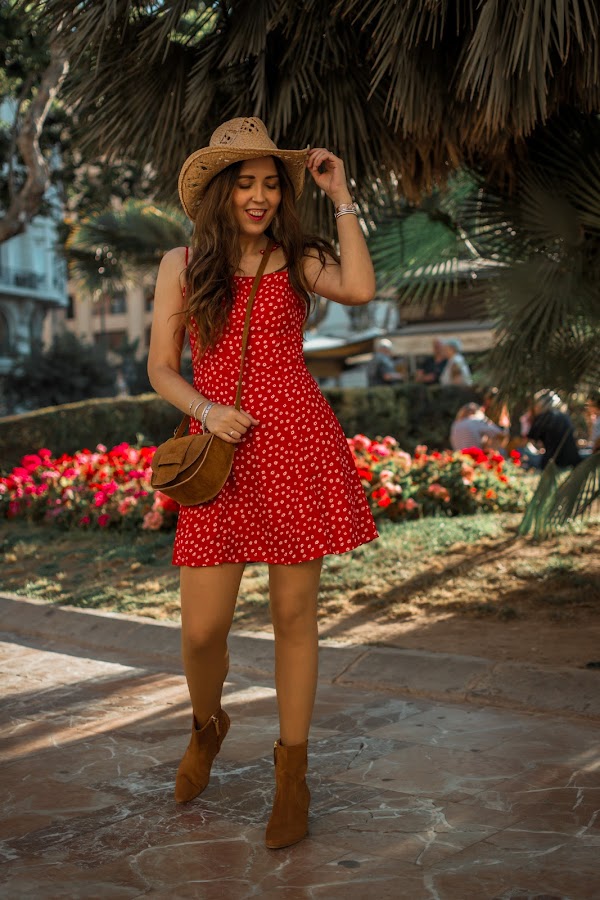 Vuelvo con mis sombreros, los echaba de menos y no he visto mejor ocasión que esta para enseñaros un nuevo look con uno de ellos, un tanto diferente a los que suelo utilizar. El outfit es un poco Hannah Montana, pero es perfecto para esos conciertos de verano o también, para salir una tarde y pasear. Combiné el sombrero con un vestido rojo, de tirantes con escote cuadrado y pequeñas flores estampadas. El vestido es cortito, vaporoso y la parte de la espalda es de nido de abeja, por lo que se adapta perfectamente. Para los complementos, siempre me decanto por marrones. Los botines bajitos, el bolso y unos pendientes llamativos, completan el look de hoy.