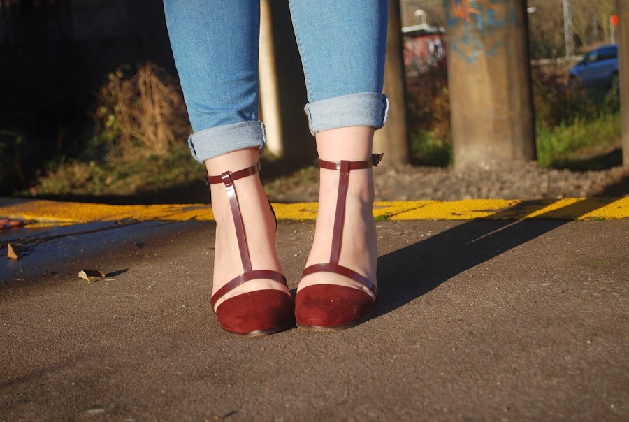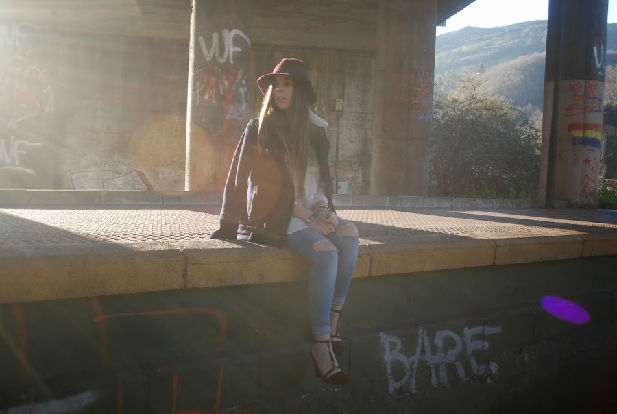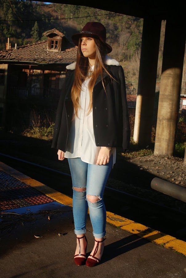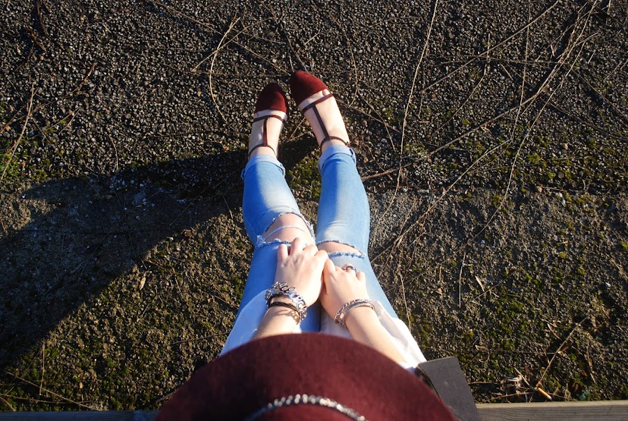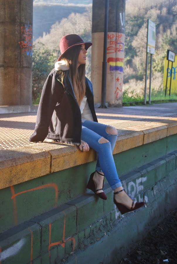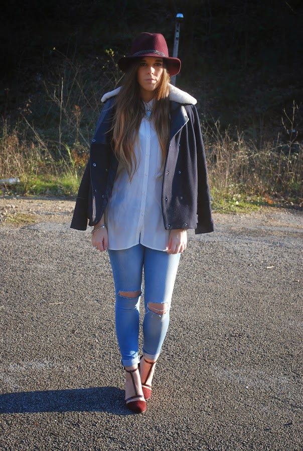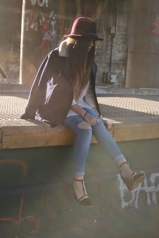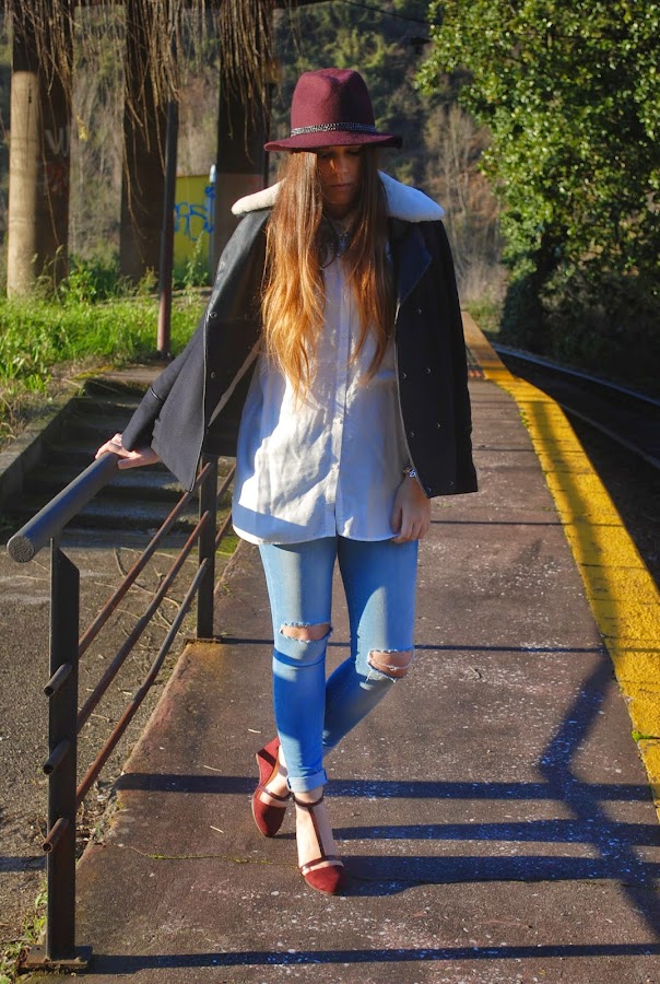 Como no hacía mucho frío, me hice la valiente y salí con camisa, jeans rotos, mis nuevas cuñas granates y gorro a juego. Y para terminar, complementos en plateado.