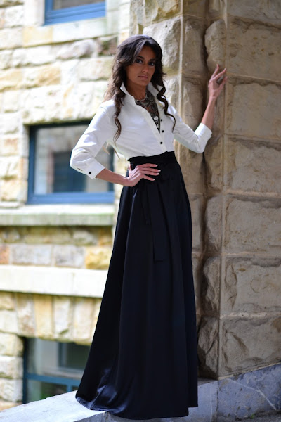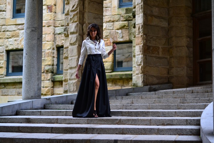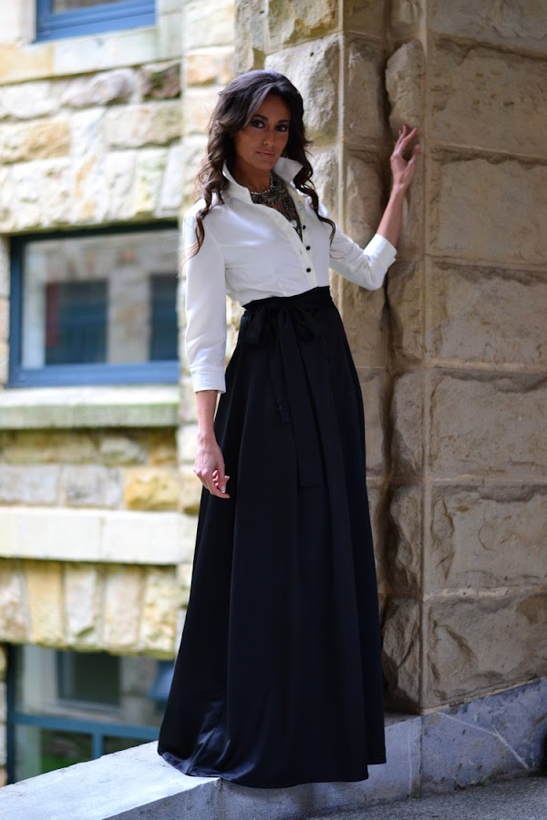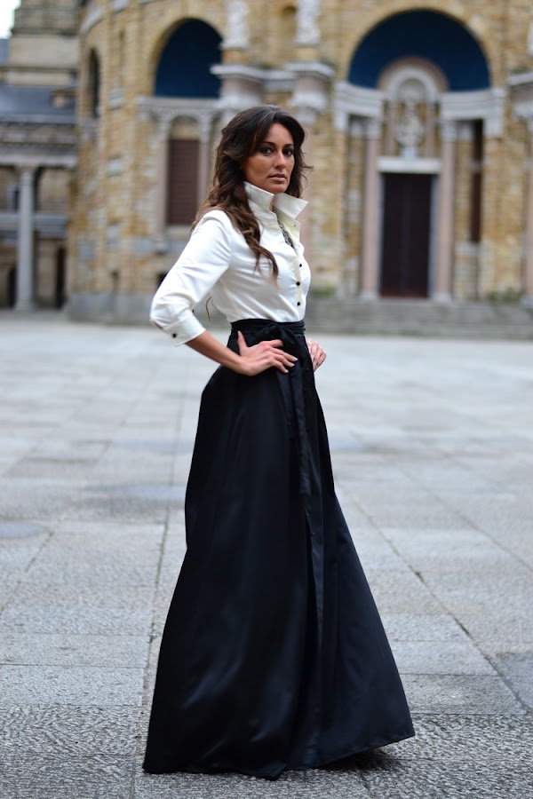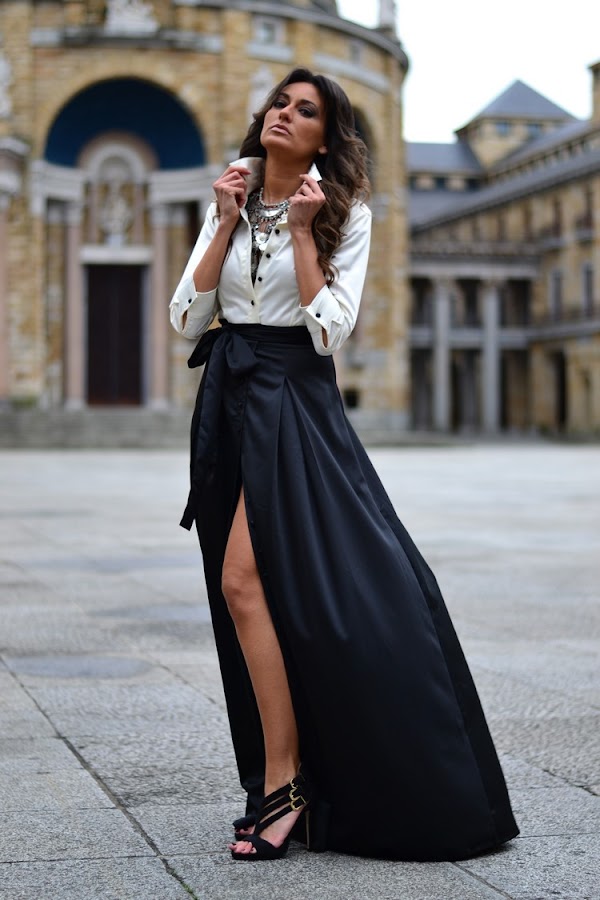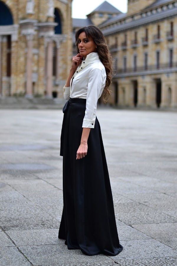 El caso es que cuando me lo probé, inmediatamente me di cuenta de que era justo lo que andaba buscando porque quería evocar un estilo elegante, pero relajado a la vez y en sintonía con el escenario diseñado por Ikea que, si recordáis, emulaba un armario vestidor en blanco y negro (casualmente las mismas tonalidades de la prenda). Además, durante la charla, cuando hablaba de la camisa blanca perfecta, precisamente recogía un ejemplo de un look que me chifla, muy Naty Abascal, quien en más de una ocasión ha apostado por vestirse a la neoyorkina, con una camisa blanca de noche combinada con una falda larguísima de vuelo, en la línea de como iba yo vestida (a excepción de que el mío no era un dos piezas, sino un vestido). Es más, recuerdo haber visto también a las Reinas Doña Letizia y Rania de Jordania (que me encanta) de esta guisa en alguno de sus actos oficiales.