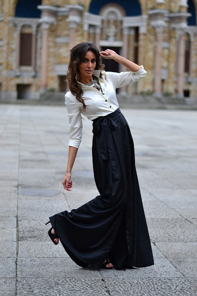 Aunque Rocío y yo pensamos que para romper con el formalismo propio de este look y restarle algo de sobriedad, sería adecuado meterle una pieza de bisutería y apostamos por un maxi collar que lo animara un poco, porque como yo también expliqué en el taller, es bueno no tener miedo a experimentar; hay que atreverse a jugar con los contrastes de la moda, mezclando y superponiendo accesorios que contrasten y nos desmarquen un poquito del resto, combinado la costura con el low cost, para no ir todas por la calle uniformadas como muchas mujeres que siguen las normas de estilo dictadas por las pasarelas, las revistas y los blogs a rajatabla. Tenemos que convertirnos en personas especiales a la hora de vestir, escapar de la monotonía... asumiendo que, lógicamente, no podemos gustarle a todo el mundo, claro.