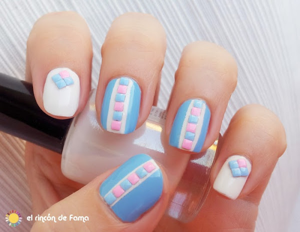 La manicura es muy sencilla, sobre las uñas pintadas con el color base hacemos una franja de color blanco y sobre esta (cuando esté seca) ponemos una tira de tachuelas en colores alternos, sobre los dedos índice y anular ponemos las tachuelas con otra forma y listo:
