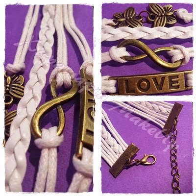 Aqui podeis verlo todo con mas detalle, la pulsera esta muy bien rematada y el cierre tiene una cadena para hacer extensible la pulsera. Los detalle en oro viejo son dos mariposas, el simbolo de infinito y una chapita con la palabra "Love". Me parece que es una pulsera muy bonita, ponible y sencilla que queda genial y se puede combinar con muchisimas cosas.