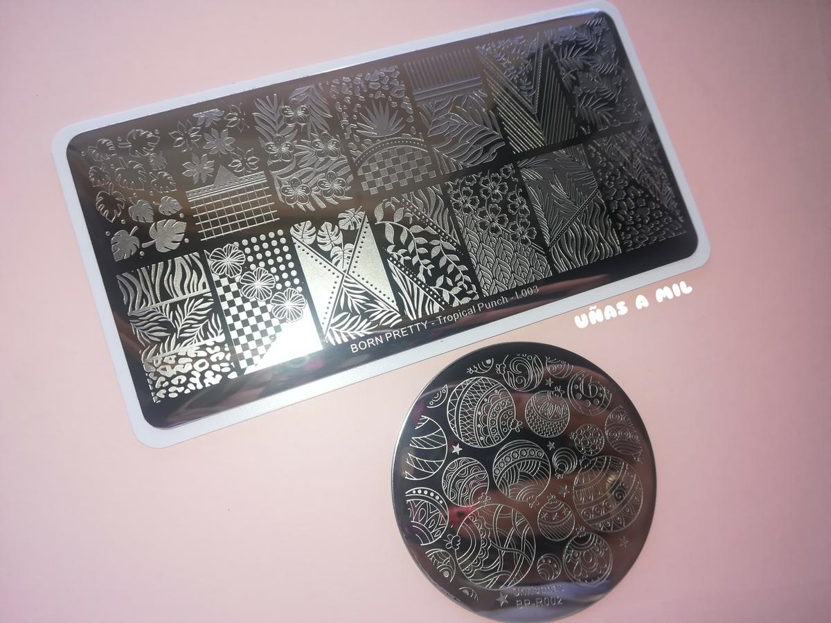 – Placas de estampación: escogí dos, una circular con diseños de bola de Navidad para las fechas que se acercan, y otra rectangular con diseños tropicales, de flores y hojas junto con animal print.