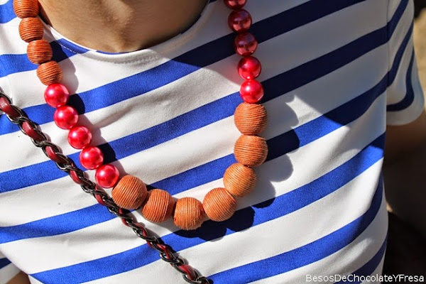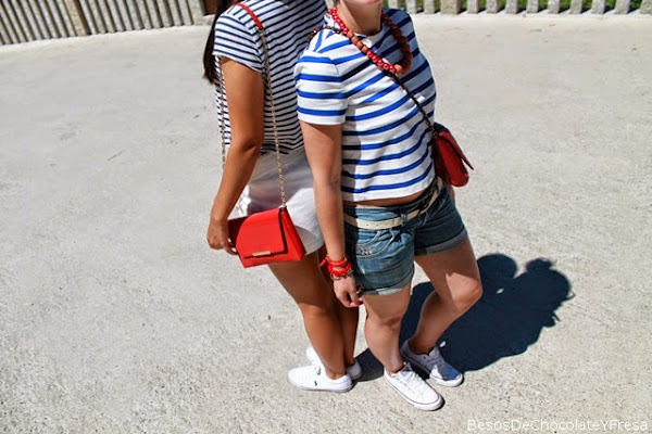 En mi caso llevo shorts denim con top crop también navy y como complementos converse en blanco y también bolso en rojo a juego con un par de pulseras y el collar.