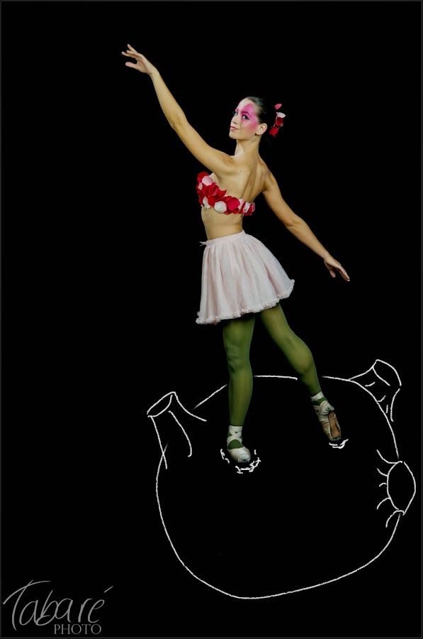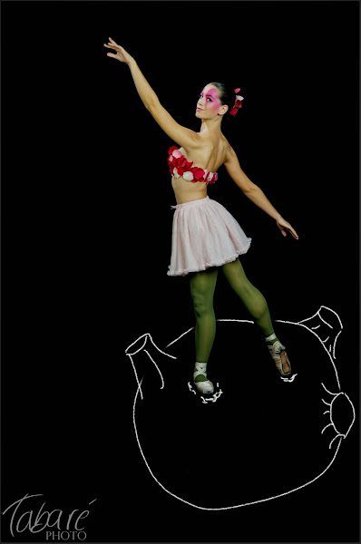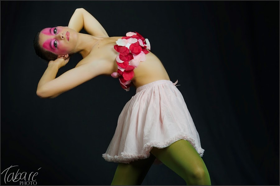 La intención era crear un maquillaje armonioso y teatral que acompañara los movimientos y las poses de la bailarina. Para ello mezclé colores como el rosa, el amarillo y el verde hasta conseguir el resultado que podéis ver en las fotos.