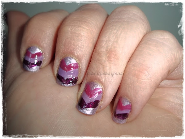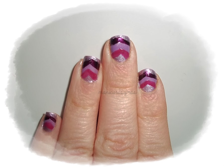 Para la base utilicé el esmalte Prom Queen y para realizar las franjas para conseguir unas chevron nail usé los esmaltes Sangria, Bouquet y vamp. No quise utilizar ninguna guía y lo dibujé con un pincel finito a mano alzada.